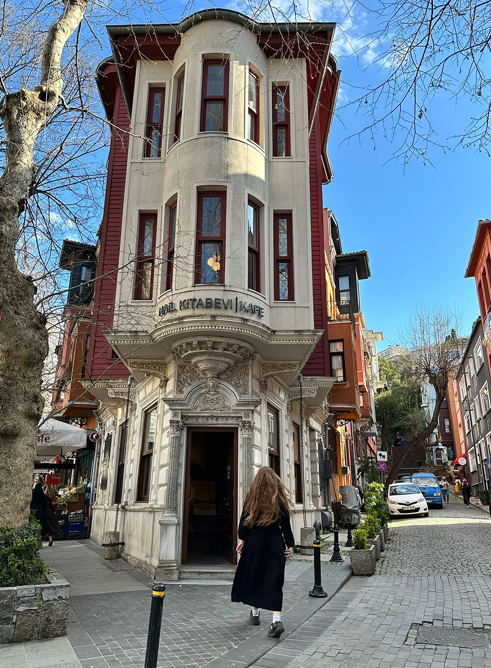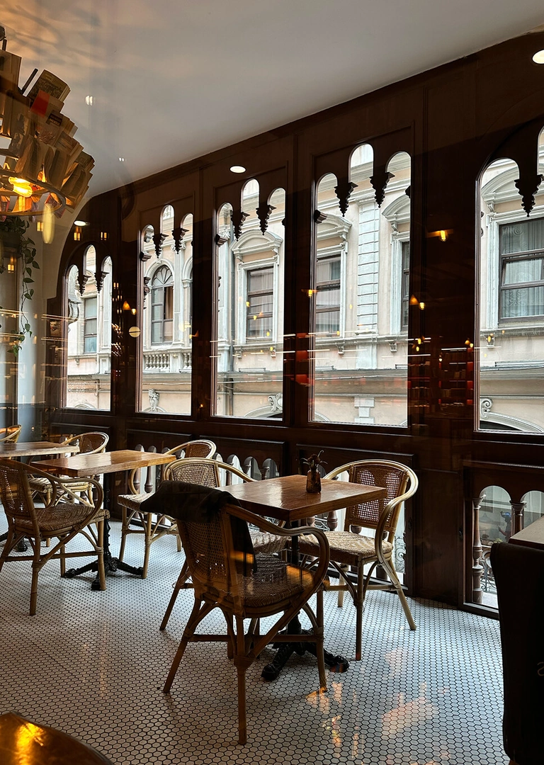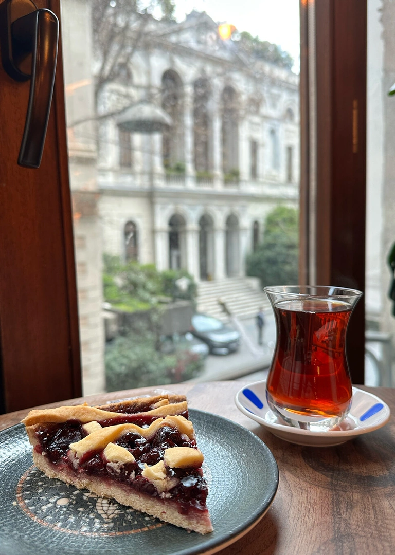 Это одновременно и кофейня, и книжный — идеальное сочетание. Здесь очень приятно зависнуть у окна: с одной стороны — красивый вид на эстетичную улицу, с другой — буквально в шаге легендарный Pera Palace, тот самый отель, построенный для пассажиров Восточного экспресса, где, по легенде, Агата Кристи написала свой знаменитый роман.