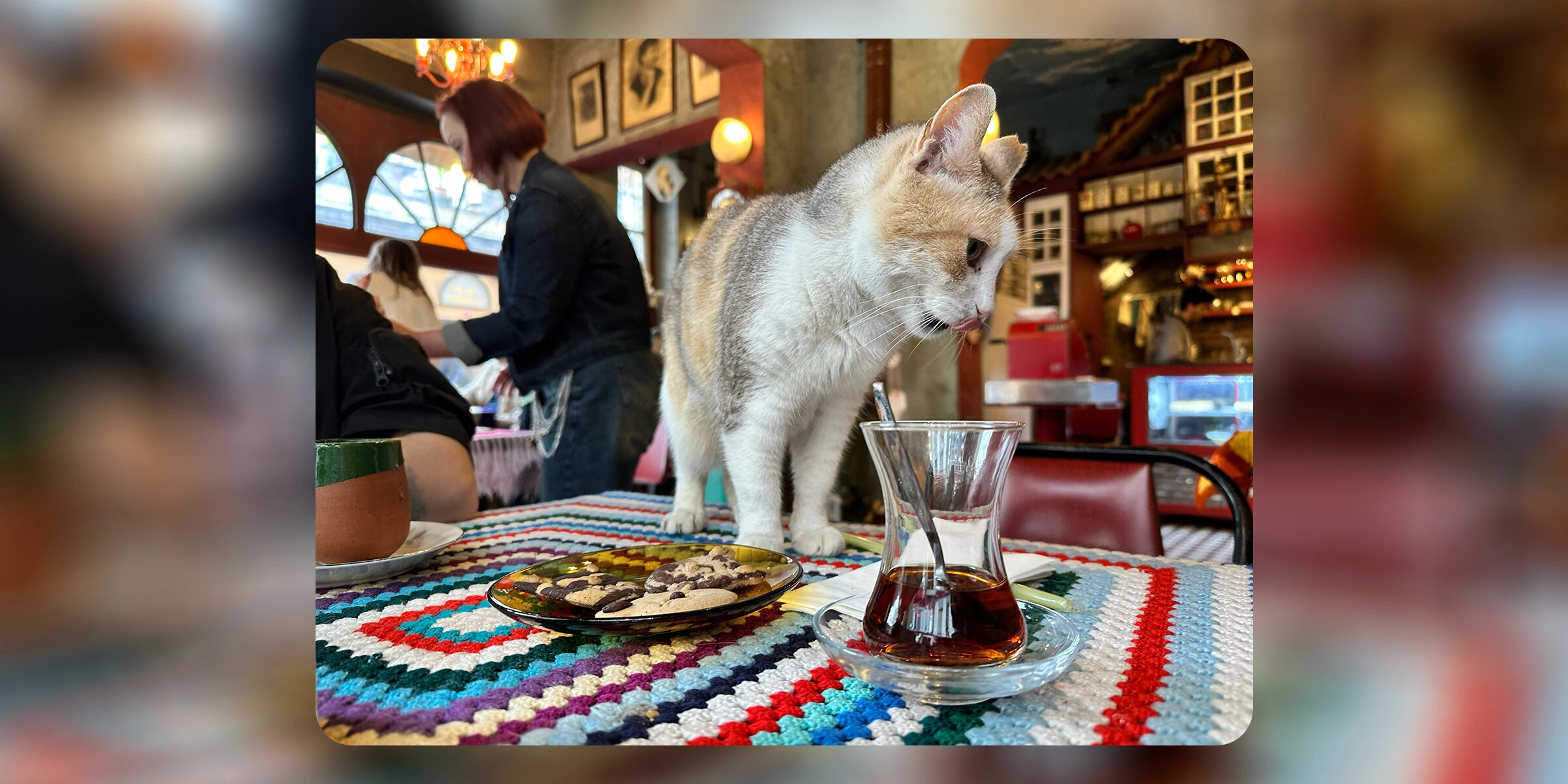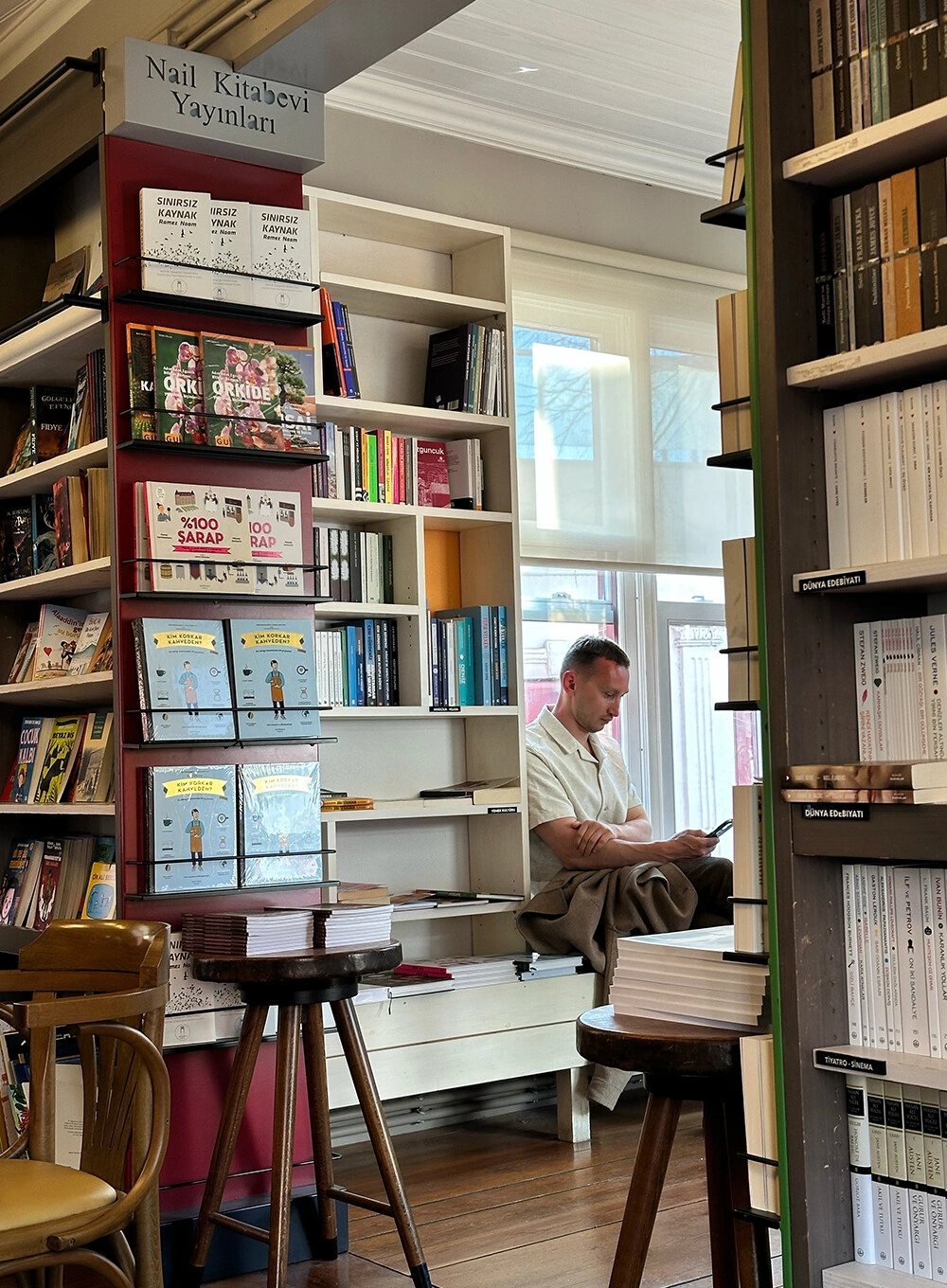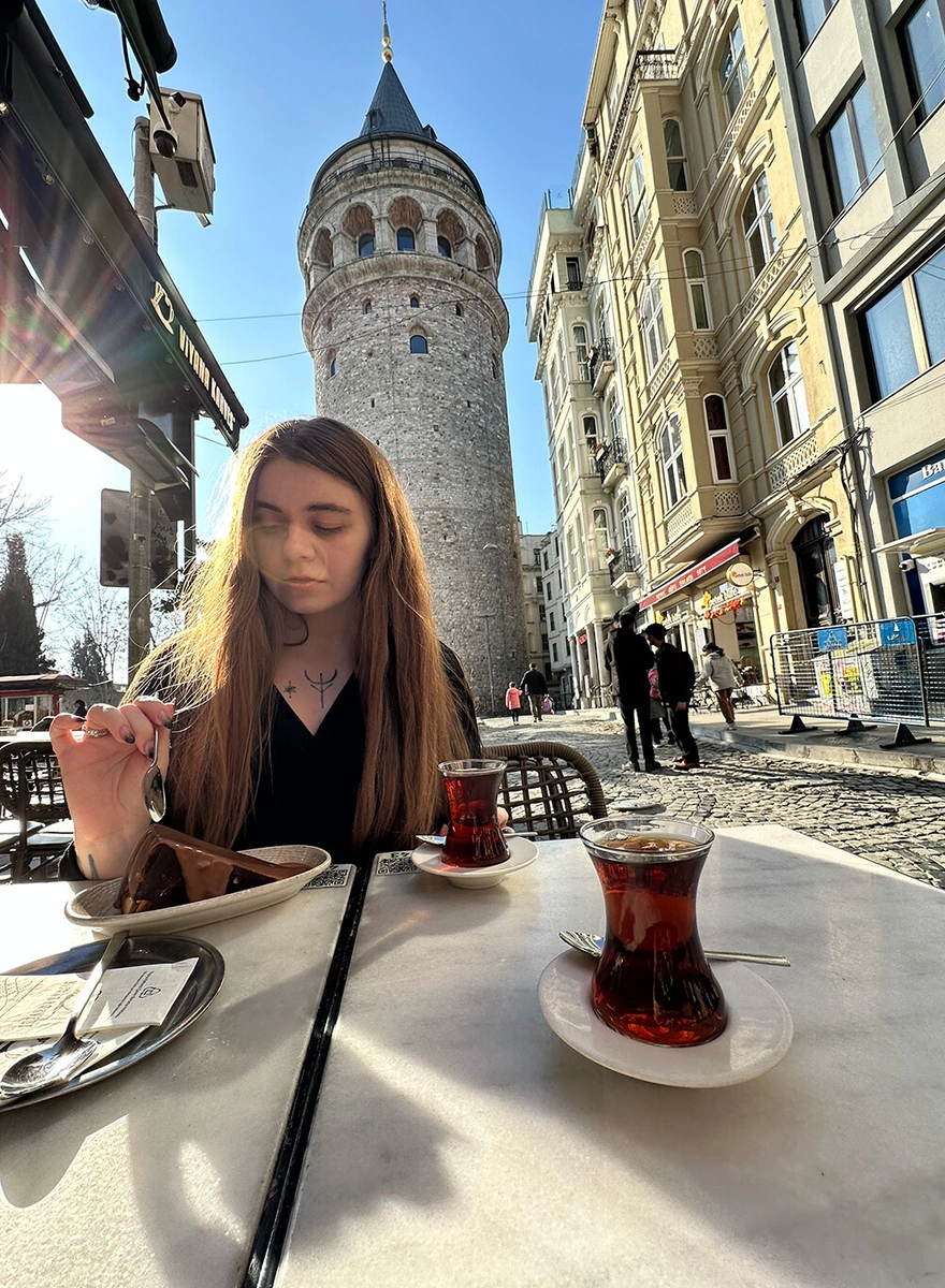 Это одновременно и кофейня, и книжный — идеальное сочетание. Здесь очень приятно зависнуть у окна: с одной стороны — красивый вид на эстетичную улицу, с другой — буквально в шаге легендарный Pera Palace, тот самый отель, построенный для пассажиров Восточного экспресса, где, по легенде, Агата Кристи написала свой знаменитый роман.