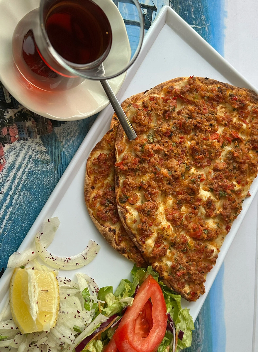 Мы заодно попробовали и лахмаджун на одной из террас — что-то вроде тонкой мясной лепёшки, дальний родственник пиццы. Для меня он оказался чуть жирноват, с сильной перебивающей вкус специей, но ради знакомства с кухней есть можно.