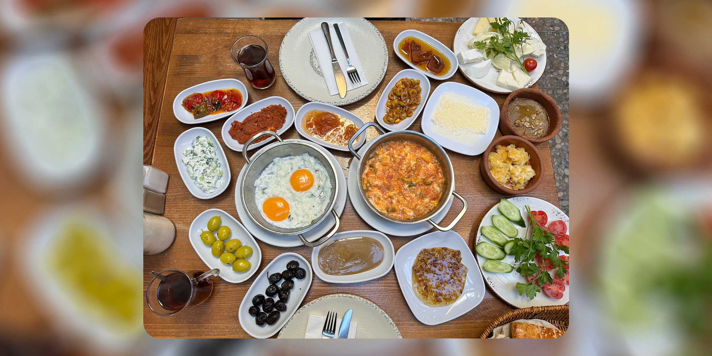 Если в моей статье есть один пункт из серии «обязательно прожить», то это турецкий завтрак. Серьёзно. Не просто попробовать и поставить галочку, а именно прожить: яйца в нескольких вариациях, вкуснейший менемен, сыры, оливки, овощи, мёд, варенье, свежий хлеб, чемен , каймак, тахини и чай без ограничений.