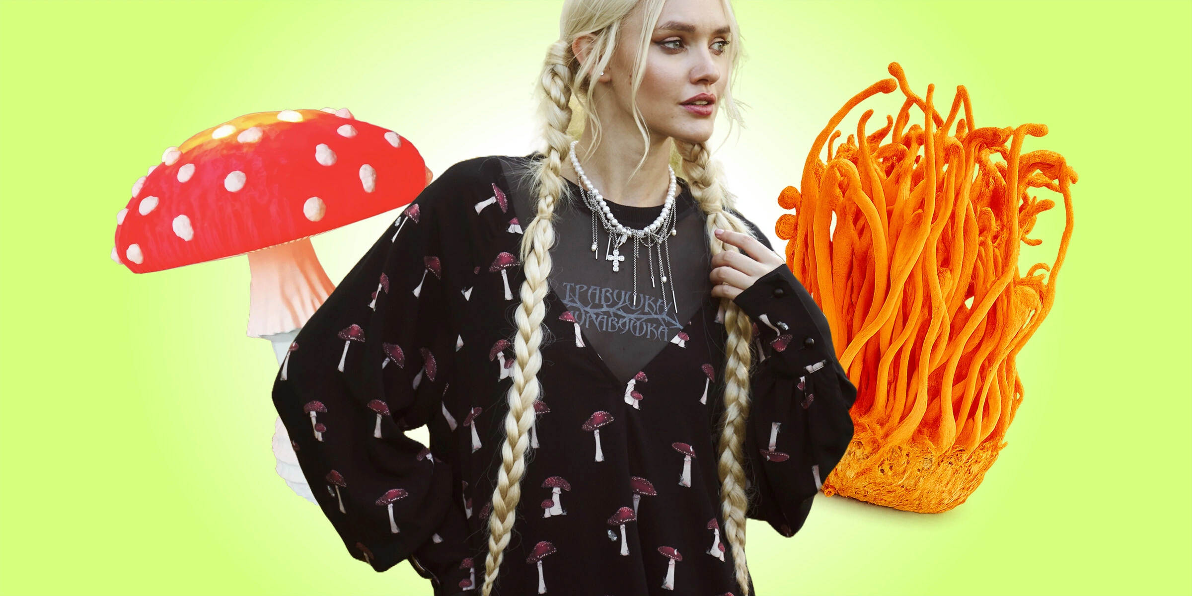 Сложно сказать, старый это тренд или новый, скорее вечный. Бренды одежды выпускают вещи с грибными принтами. Например, целая коллекция «Темнолесье» от Beautiful Criminals — одно из платьев вы уже видите выше на картинке. Светильник «Мухомор» почти невозможно поймать на маркетплейсах, его быстро скупают. Второй сезон The last of us популярен настолько, что кофейни выпускают блюда с грибами кордицепсами, а какао с ашвагандой, рейшей или чагой сулит много пользы.