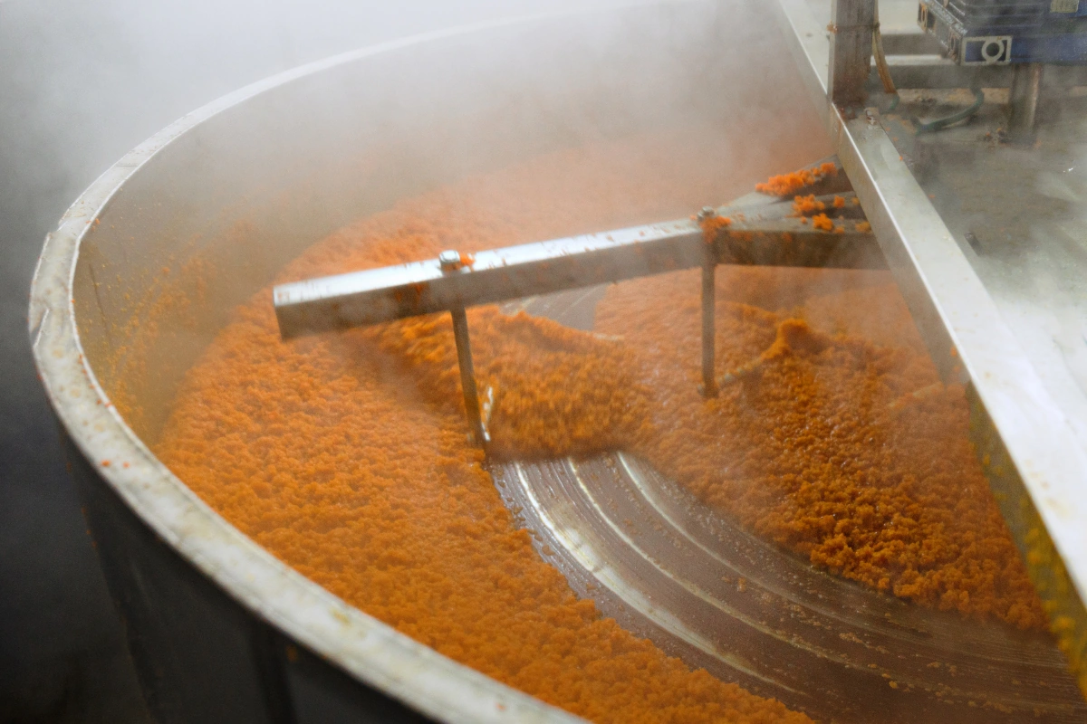 На большинстве предприятий кабачки жарят в печах. Но в нашем случае всё совсем не так: кабачок уваривают, а не жарят. Варка происходит быстро, поэтому в овощах сохраняется много питательных веществ. Кроме того, благодаря технологии уваривания в икре нет посторонних вкусов, которые могут появиться при обжаривании. В уваренное кабачковое пюре добавляют пассерованные на масле морковь и лук, всё тщательно перемешивают, добавляют специи и разливают в баночки, закатывают и стерилизуют.
