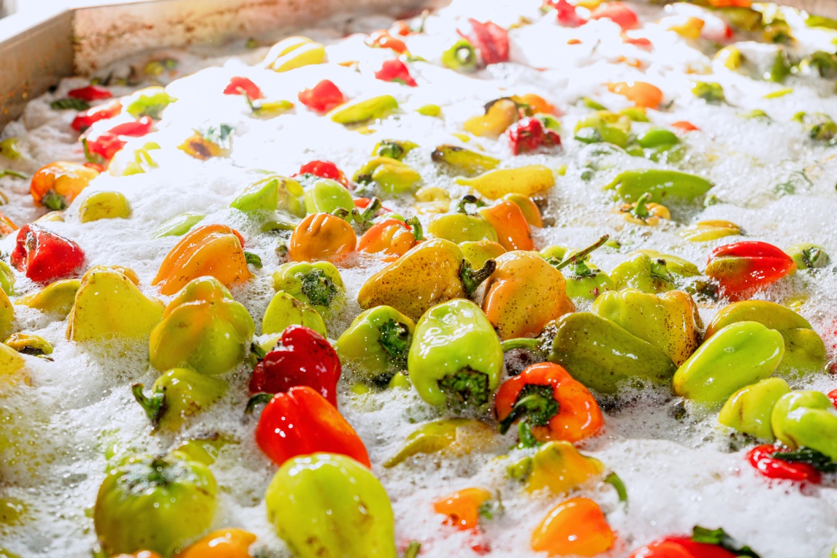 Овощную закуску «Лечо» на предприятии готовят, пожалуй, так, как если бы вы это делали дома на кухне. Представьте себе сладкий грунтовой перец, который можно купить на рынках в самом начале осени — красный, оранжевый, жёлтый, немного кривоватый, но от этого не менее вкусный. Именно такие плоды, приправленные душистым перцем и чесноком, используют при приготовлении пикантной закуски для ВкусВилла.