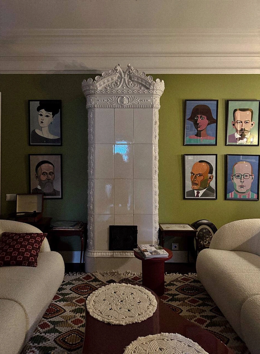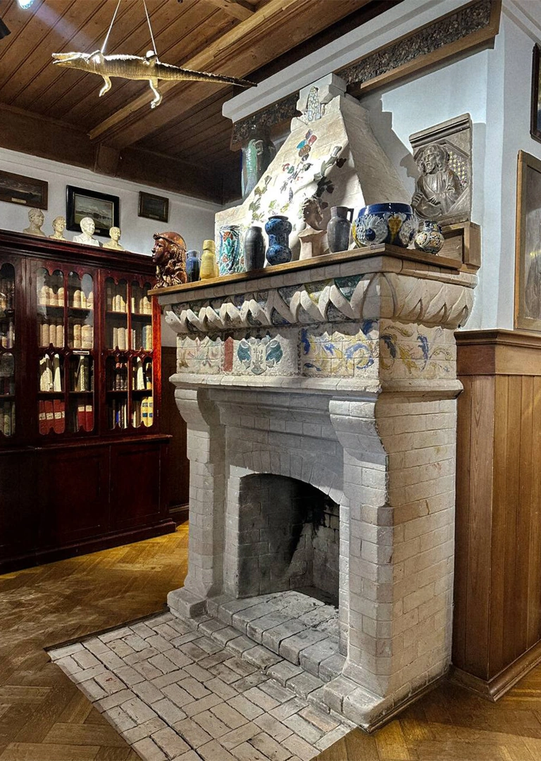 Четвёртая причина посетить Тарусу — это бутик-отель «Хоромы», куда я зашла ради одного уникального для меня экспоната. Это дореволюционная печь Сан-Галли, которую буквально по частям привезли в Тарусу прямиком с Невского проспекта, чтобы отреставрировать и отдать почётное место в музыкальной гостиной.