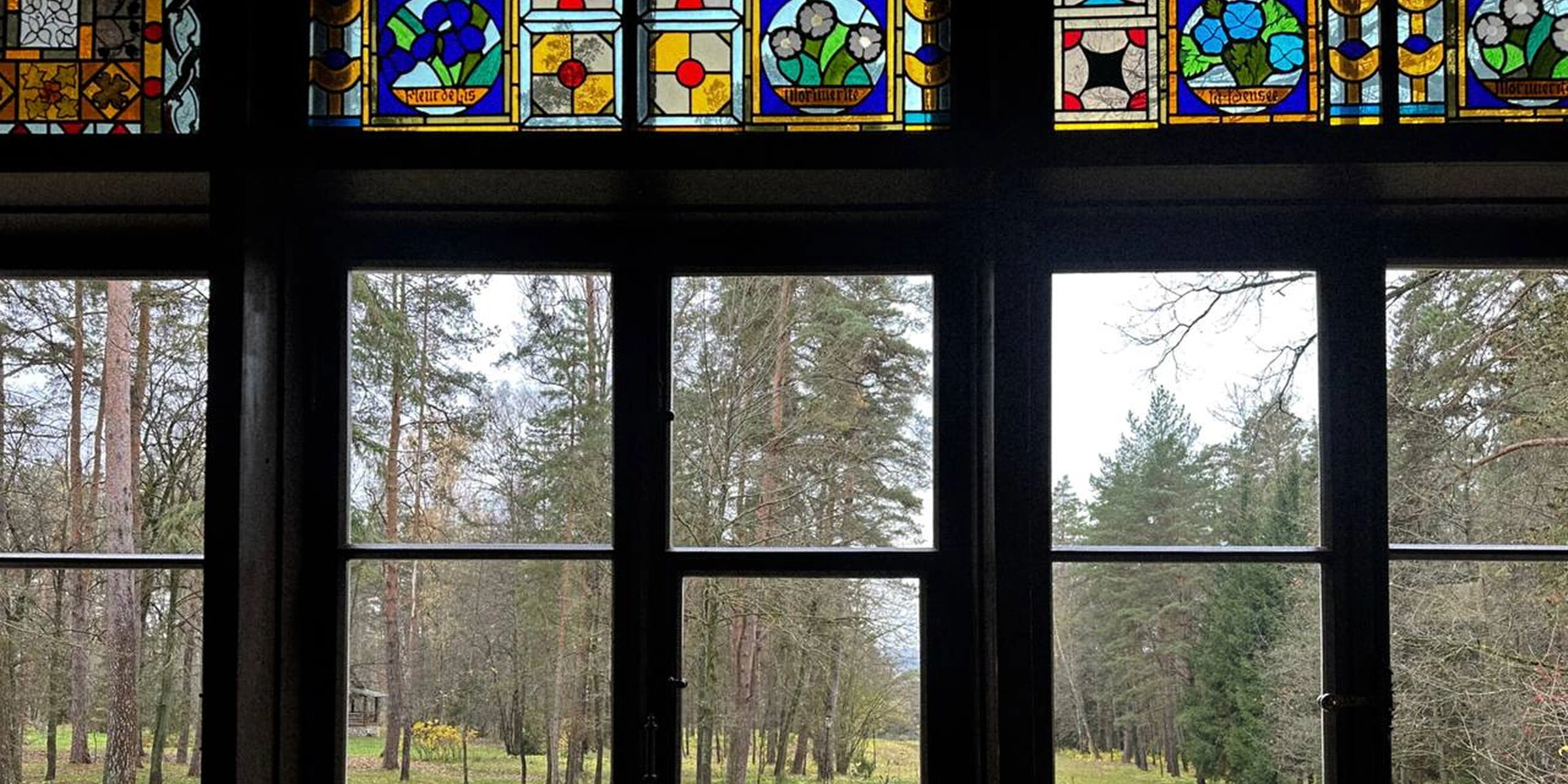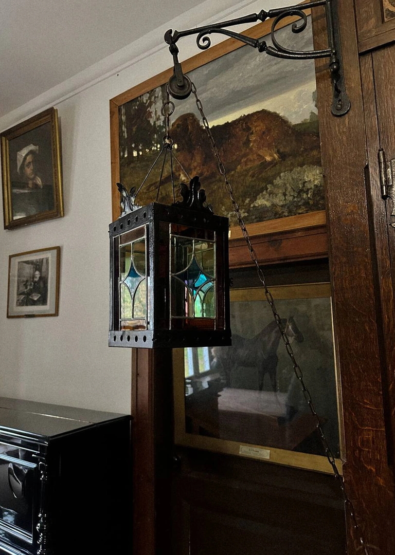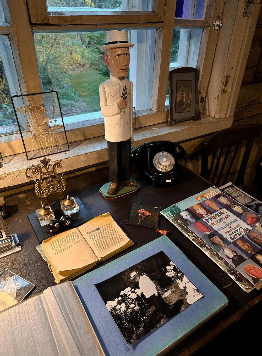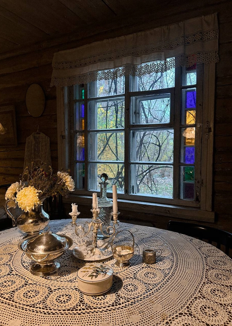 Вы увидите мебель, которую спроектировал сам художник, потрясающий камин, коллекцию майолики разных стран… Поверьте, лучше один раз съездить, потому что чего там только нет! Мне особо запомнилась расстекловка дома — рамы были специально изготовлены в тёмном цвете, чтобы виды из окон походили на много маленьких пейзажей реки Оки и соснового леса. Разглядели на фото? :)