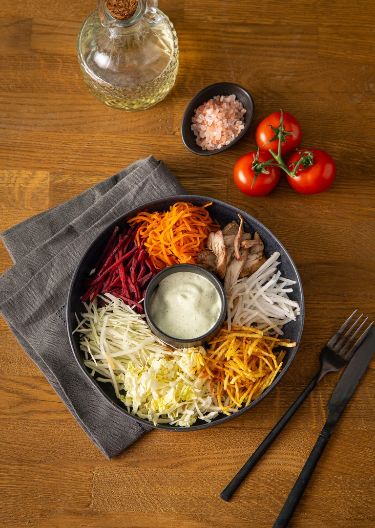 В том первом салате от ВкусВилла была предусмотрена подача «горками» — настолько, насколько вообще возможно сохранить её в готовой еде не из-под ножа. Говядину мы заменили курицей, а к белокочанной капусте добавили пекинскую. Заправку собрали из майонеза и сметаны, чтобы салат был легче.