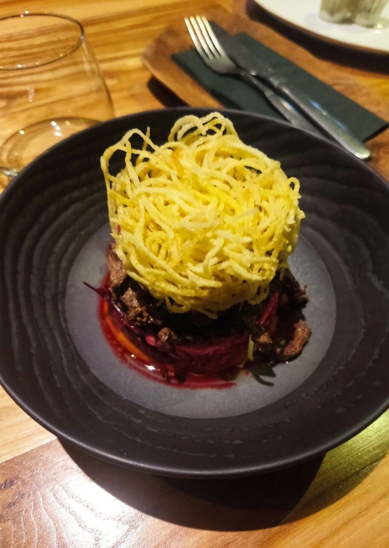 - свёкла соломкой (припущенная в масле, в котором обжаривалась говядина, или сырая);