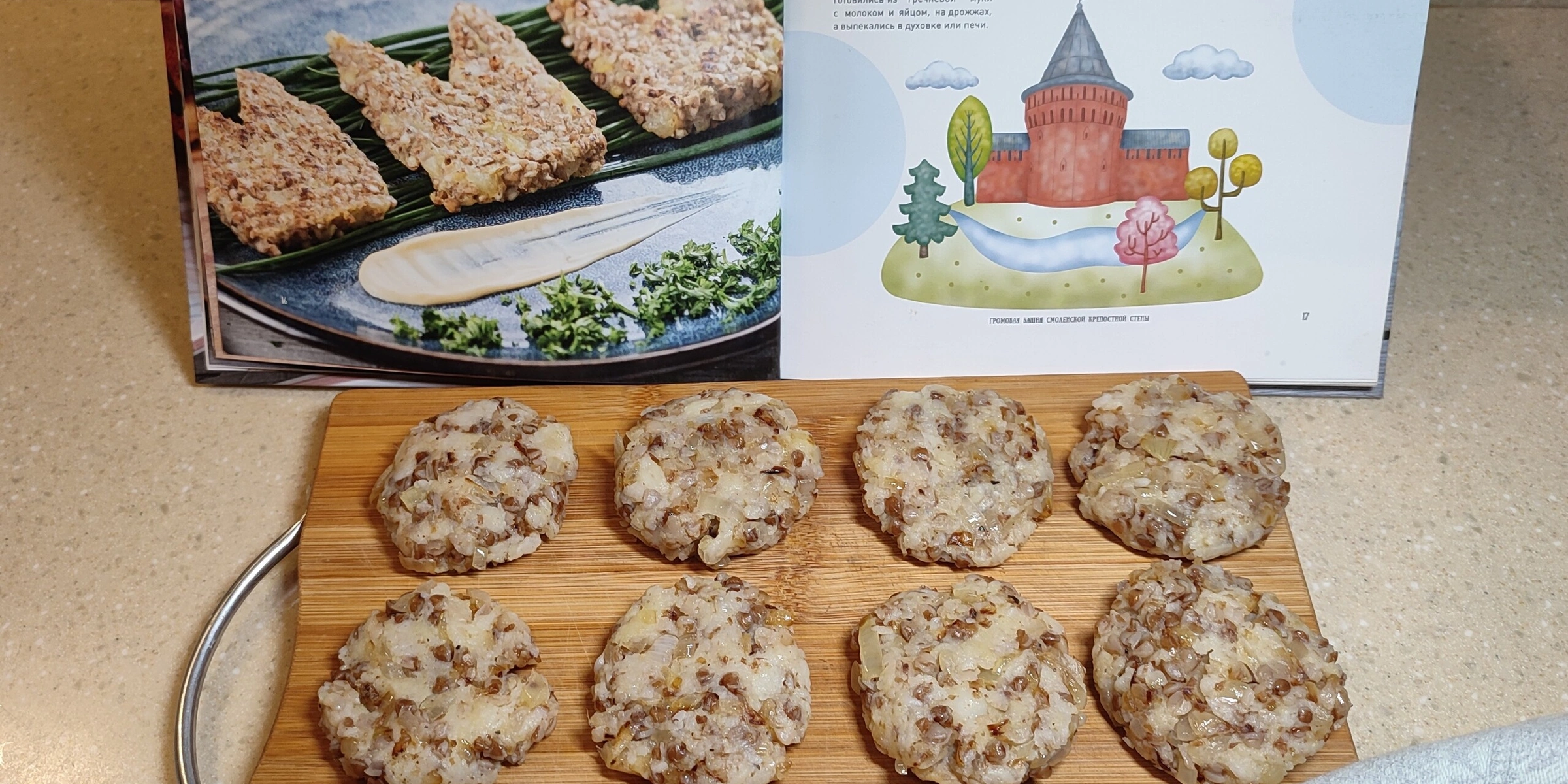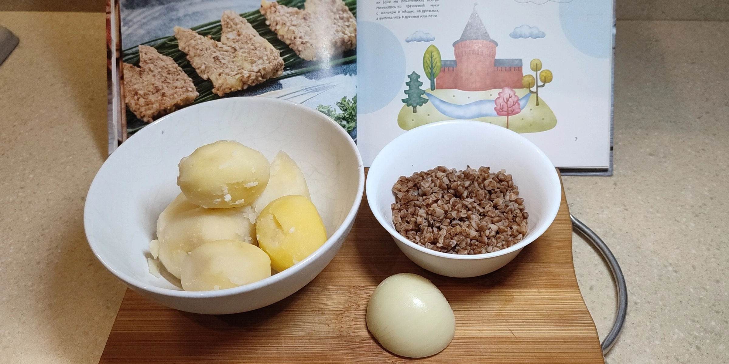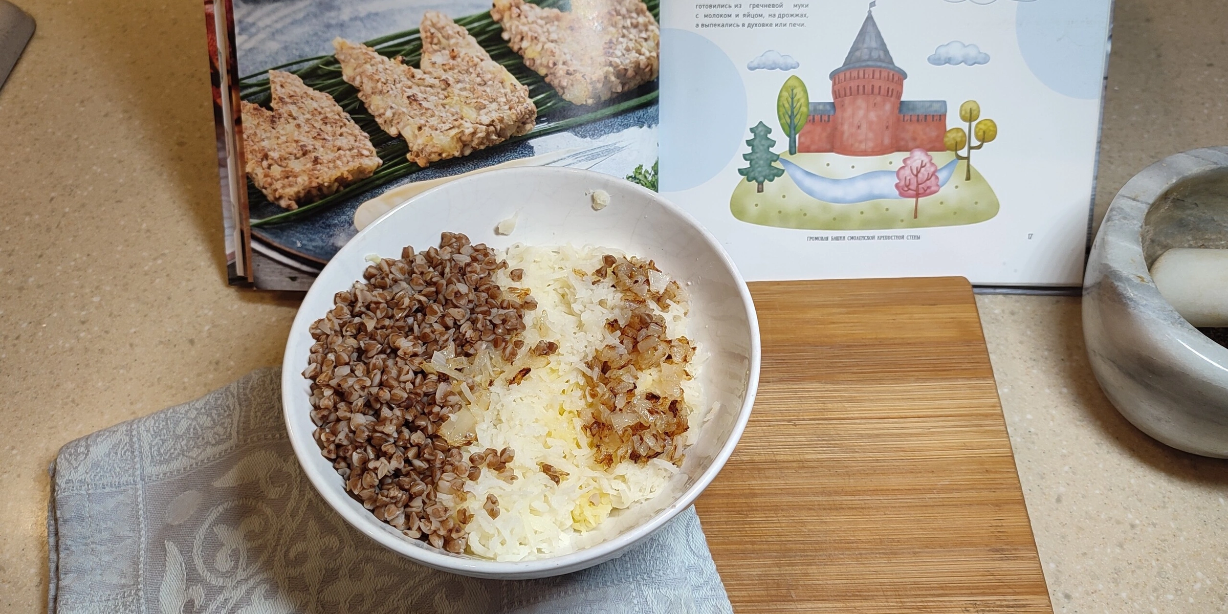 Лук нарезала мелким кубиком и обжарила до золотистости, сваренную в мундире картошку очистила и натёрла на мелкой тёрке. В миске поженила лук, картошку и гречку, слегка посолила — тесто готово. Только вот не стала изощряться с вырезанием фигурок и обваливанием в сухарях перед жаркой — просто не люблю хлебную панировку, но уверена, ржаные крошки покаченикам сильно «к лицу».