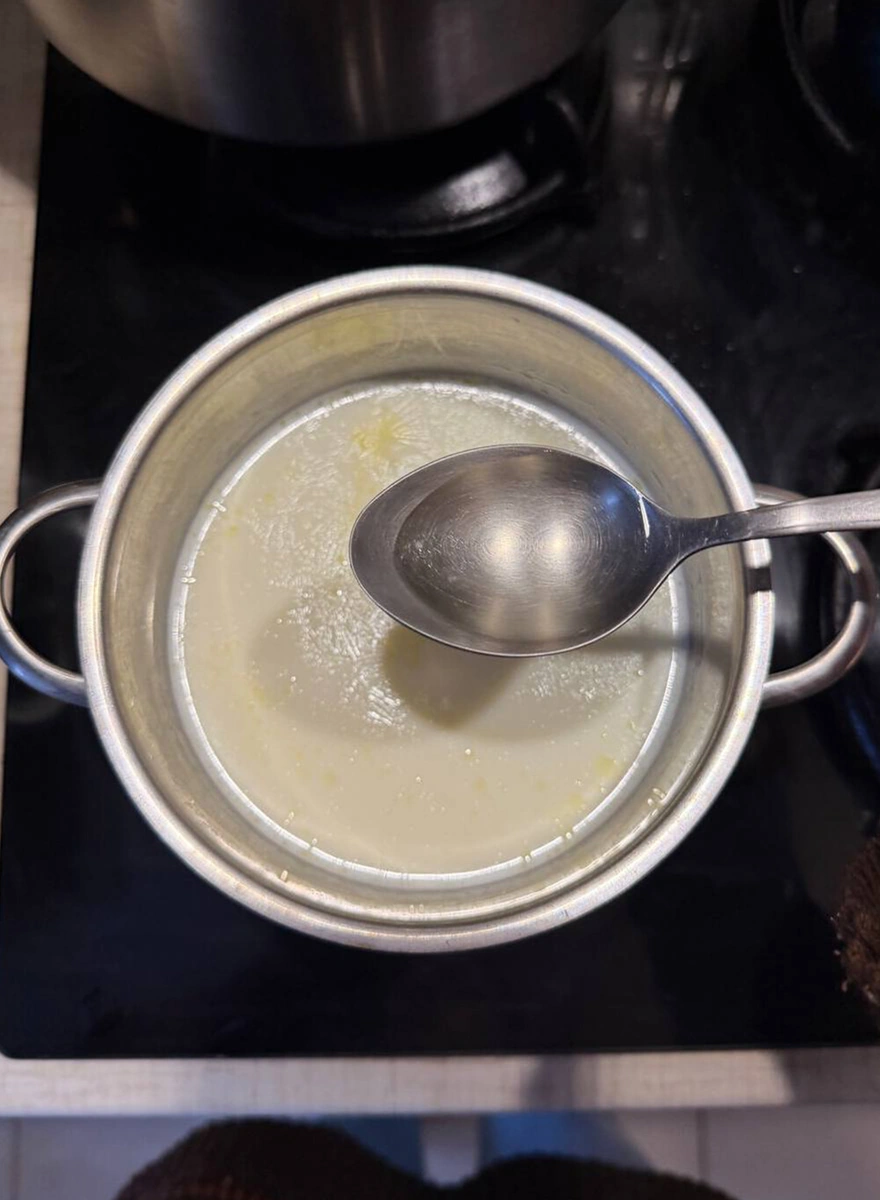 Когда масса схватится, станет видно, что она уже не просто жидкая: появляется нежный сгусток, а сыворотка постепенно отделяется.