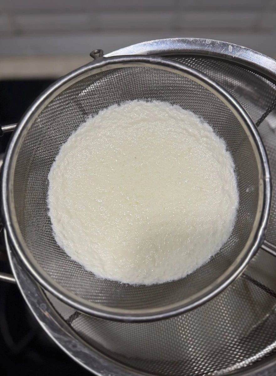 Сыворотка будет стекать постепенно, а в сите останется нежная сырная масса.