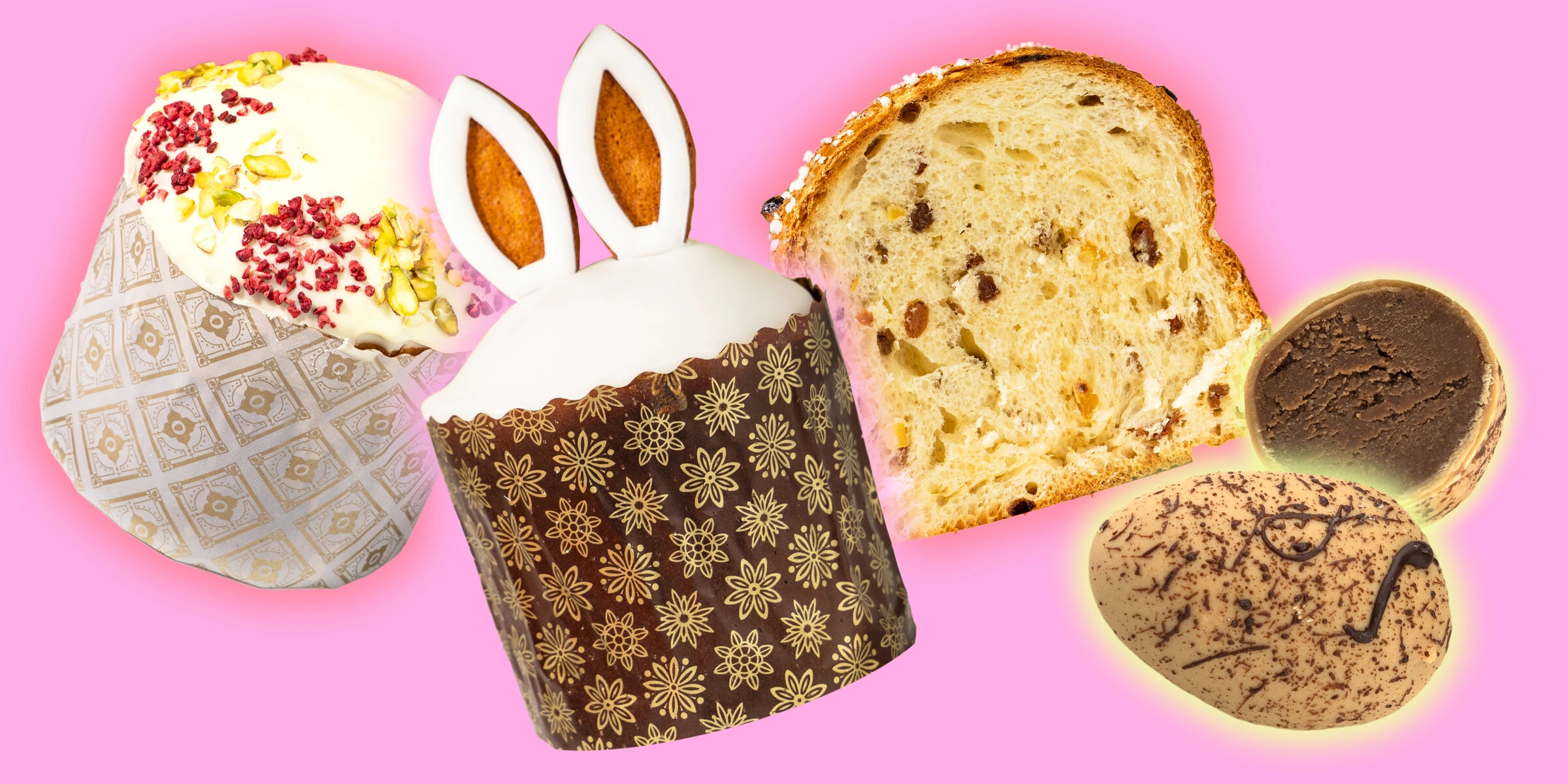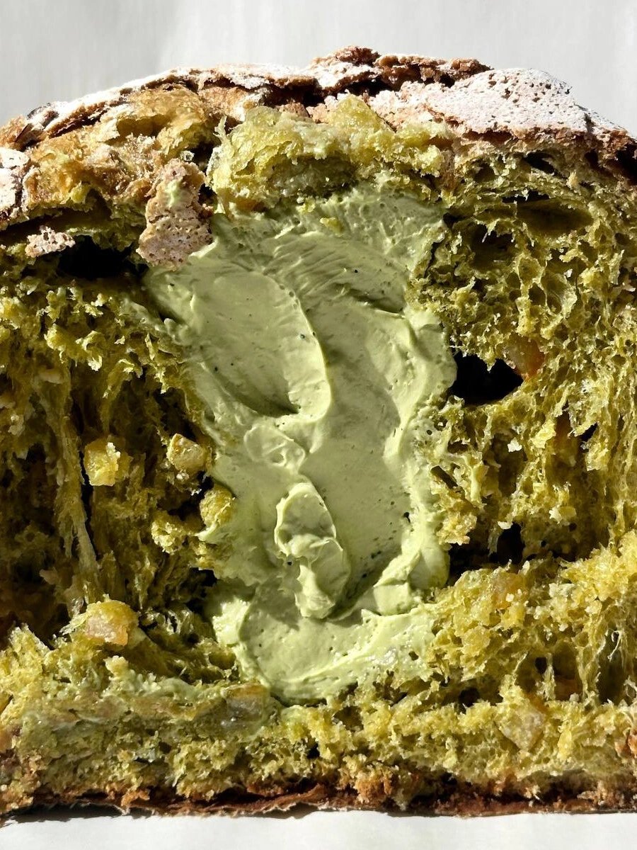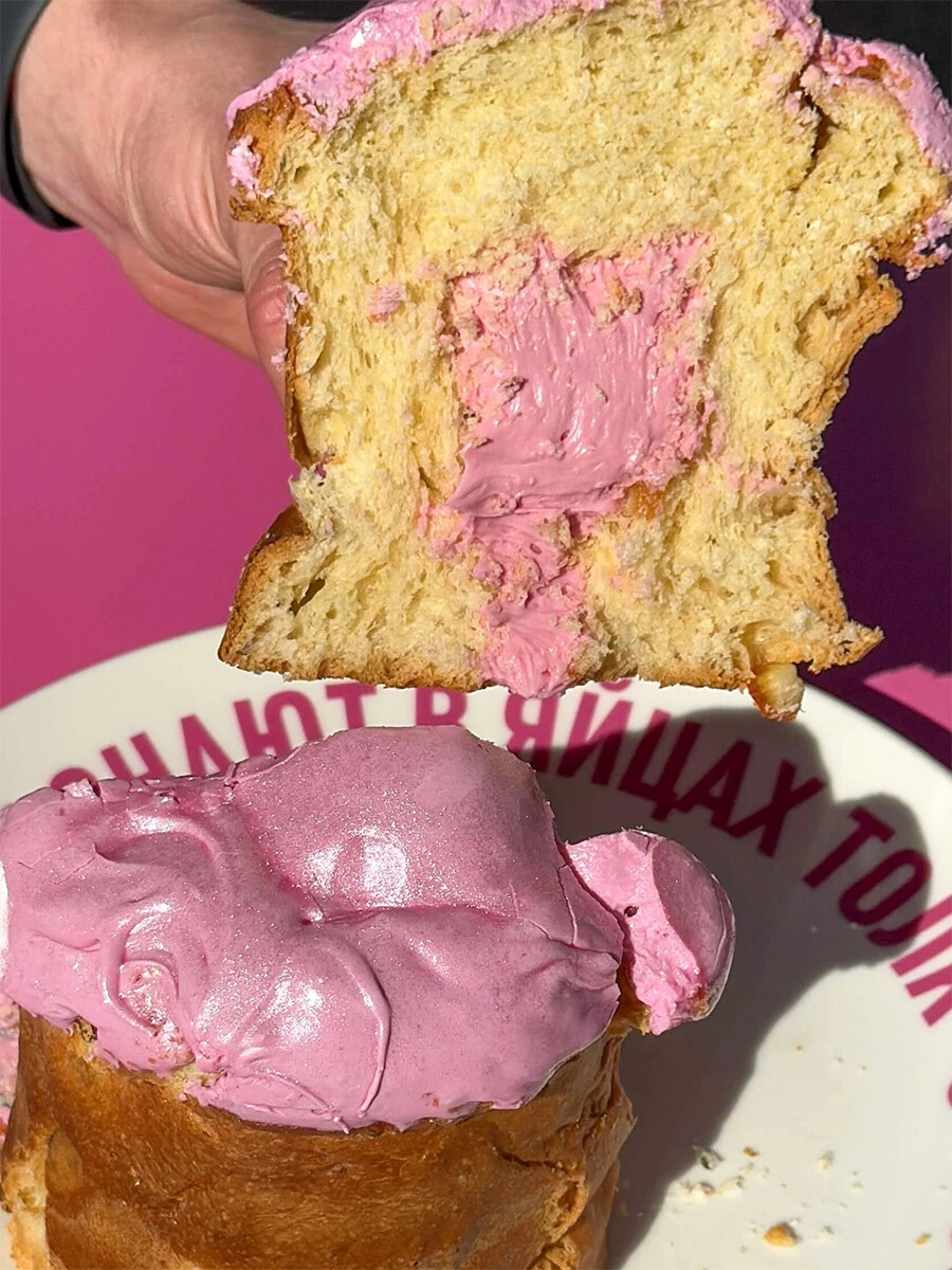 Нашли панеттоне с матчей, апельсином и белым шоколадом в пекарне Zoe и розовый игривый кулич с блёстками в кафе Eggselent. В трендовых куличах много начинки, их можно красиво, эстетично разрезать, а хлебная часть выпечки по уровню привлекательности встаёт в один ряд с шапочкой из глазури.