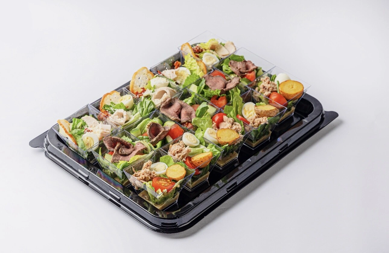- Ассорти салатов (нисуаз, с ростбифом, цезарь с индейкой) в фуршетных стаканчиках 15 шт.