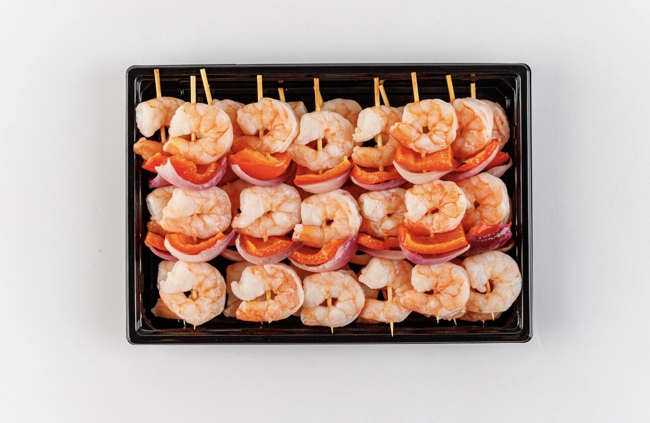 - Шашлычки запечённые с тигровыми креветками, красным луком и сладким перцем 12 шт/480 г