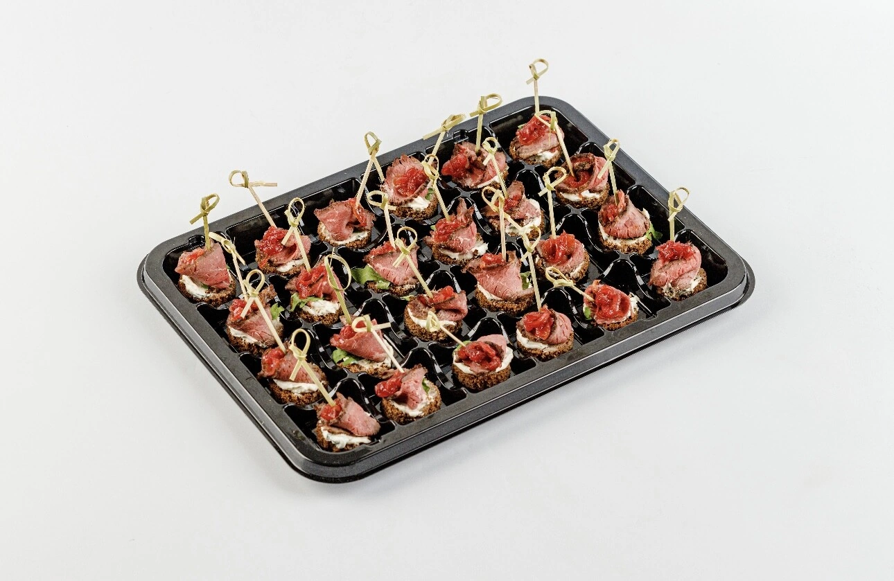 - Мини-брускетты с ростбифом и луком конфи 24 шт.