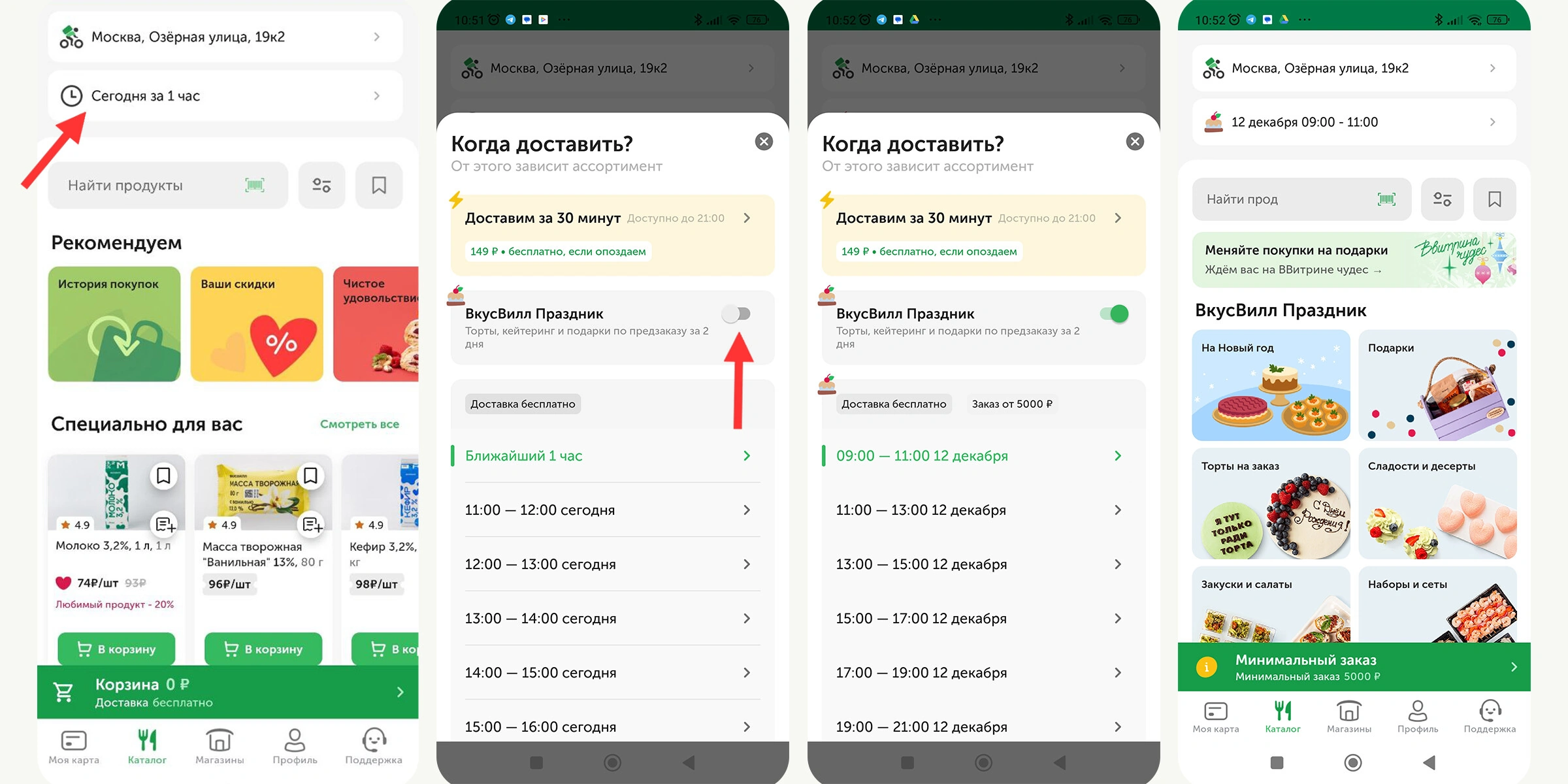 Зайдите в «Каталог». В верхней части экрана нажмите меню выбора времени и даты доставки. Нажмите переключатель «ВкусВилл Праздник». Готово — вы в каталоге проекта ВкусВилл Праздник, можно выбирать закуски, салаты, торты, десерты и подарочные наборы.