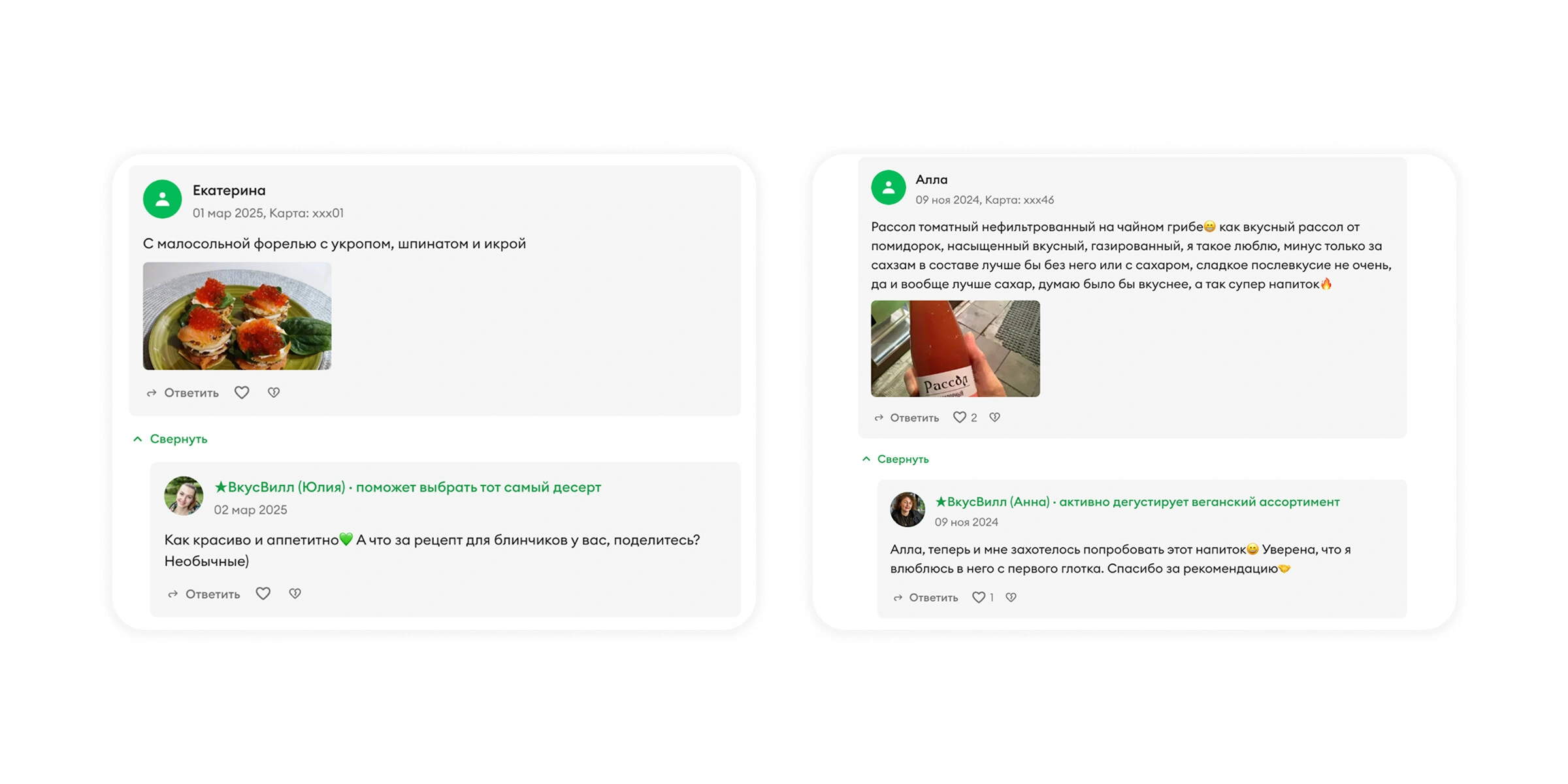 Вы можете участвовать в тематических неделях, где мы предлагаем готовить блюда по определённым рецептам, делиться своими вариантами и получать обратную связь от других членов сообщества. Или можно участвовать в розыгрышах, где разыгрываются бонусы, скидки и даже наборы любимых продуктов от ВкусВилла.
