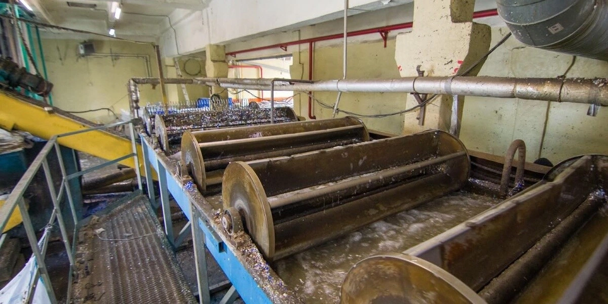 Крышечки, в отличие от пакетов, не сортируются, а сразу идут на переработку — по конвейеру загружаются в дробилку. Раздробленные крышечки попадают в ванну гидрофлотации, где моются, после чего сушатся и подаются в гранулятор для изготовления ПНД-гранул.