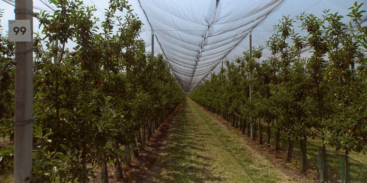 «Самые ценные сорта у нас закрыты сеткой, потому что мы всё-таки в зоне, которая подвергается воздействию града. Система обработки, система защиты оберегает деревья от всевозможных насекомых, которые очень хотят тоже скушать яблоко. А также это удобно для сбора урожая».