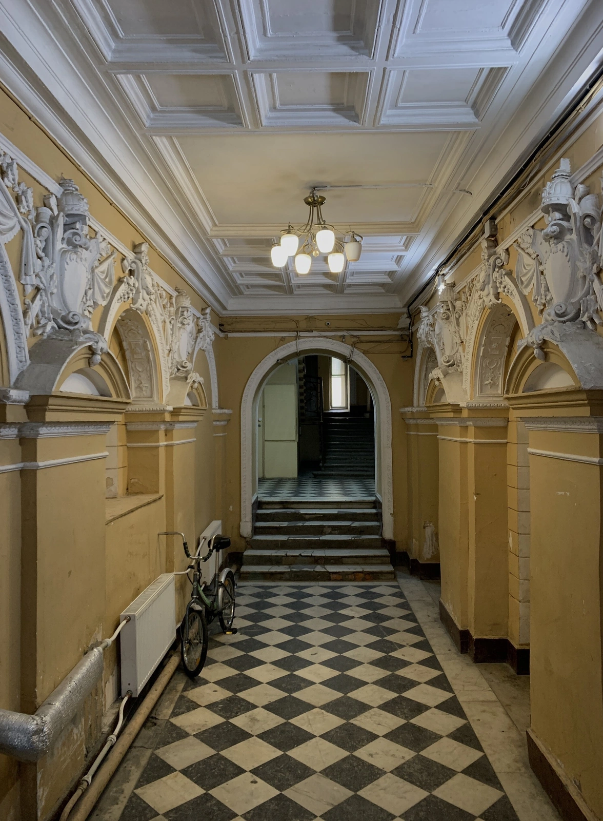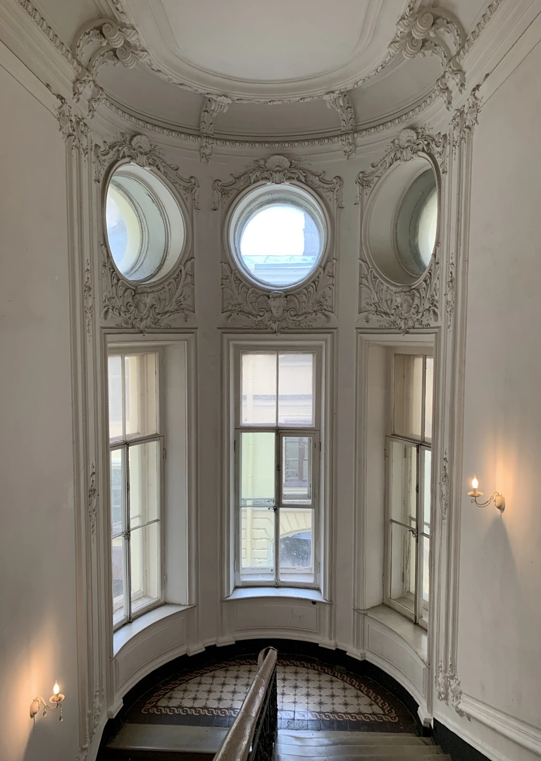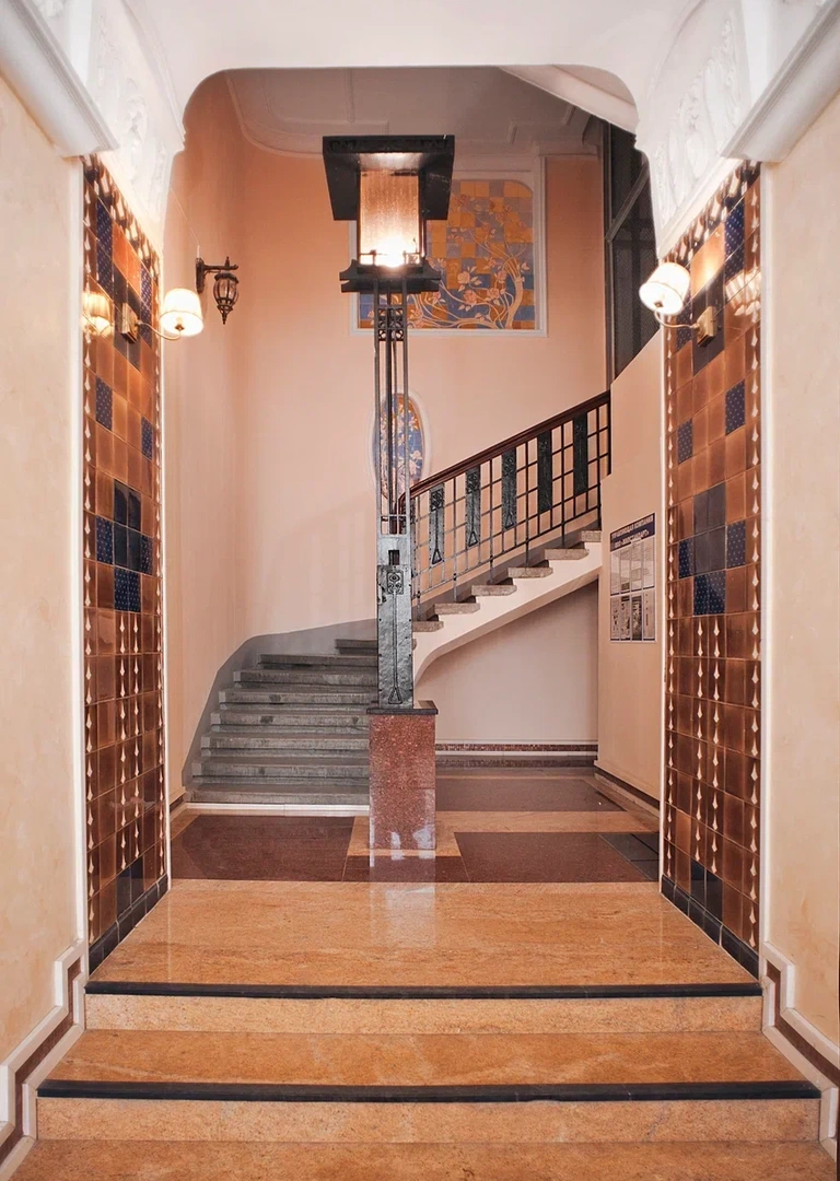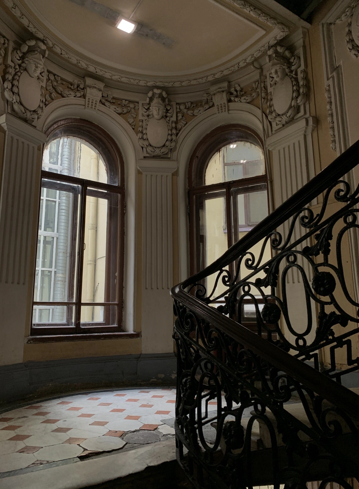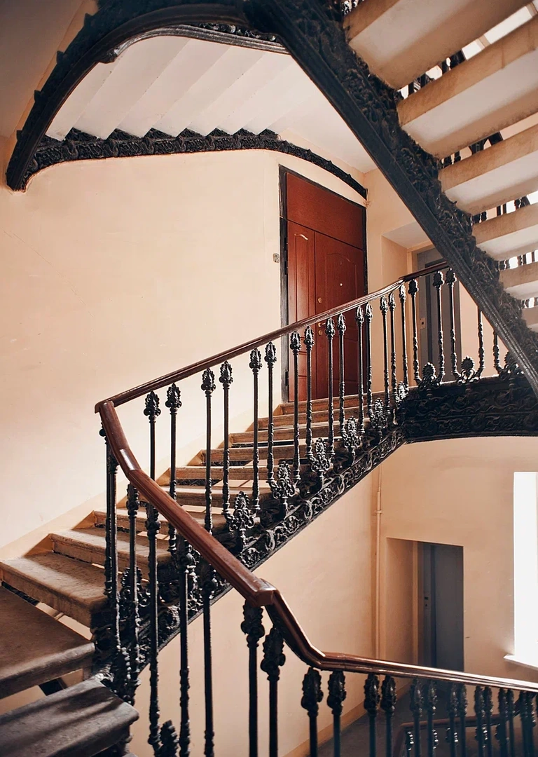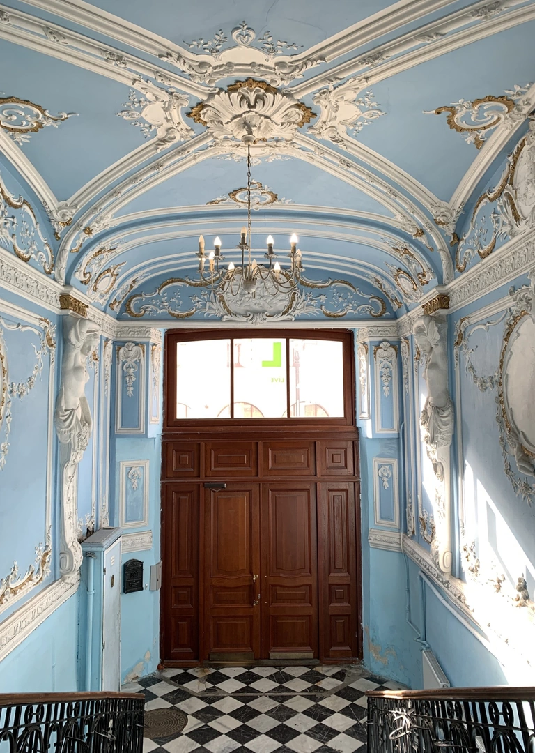 Шикарной лепнины, как в парадных Петербурга и Москвы, тут почти нет. Зато есть потрясающей красоты росписи и конфигурации лестниц (например, горячо любимые мной винтовые), ведь главный вход — это не только дверь, но и множество элементов: