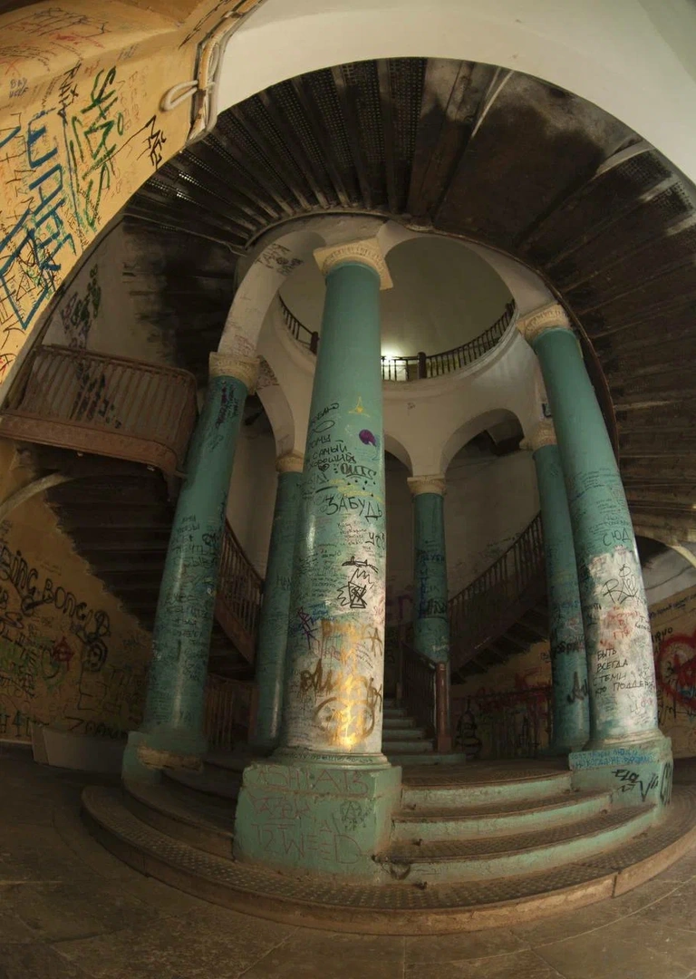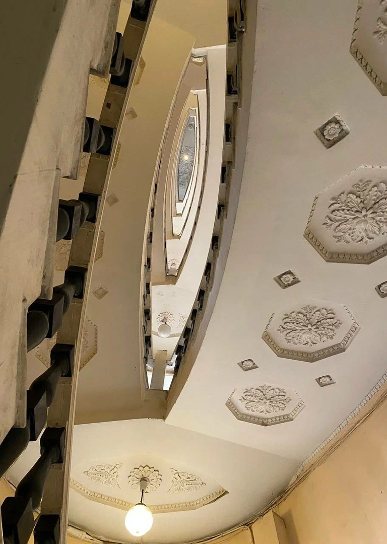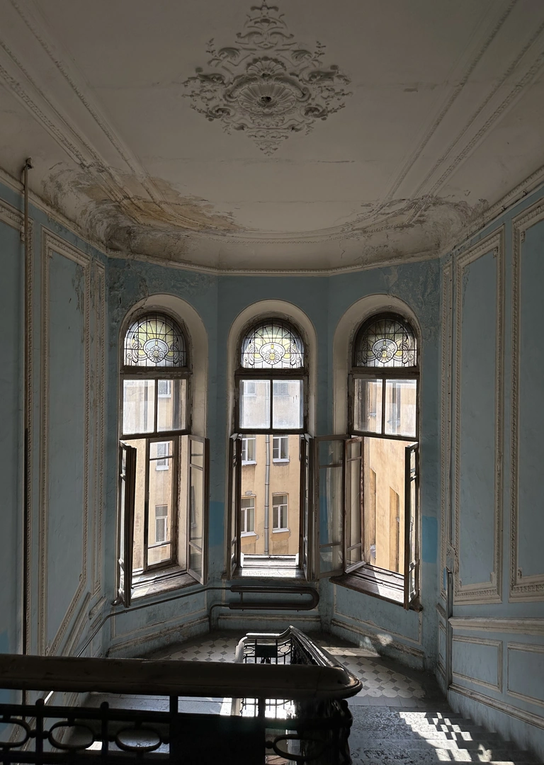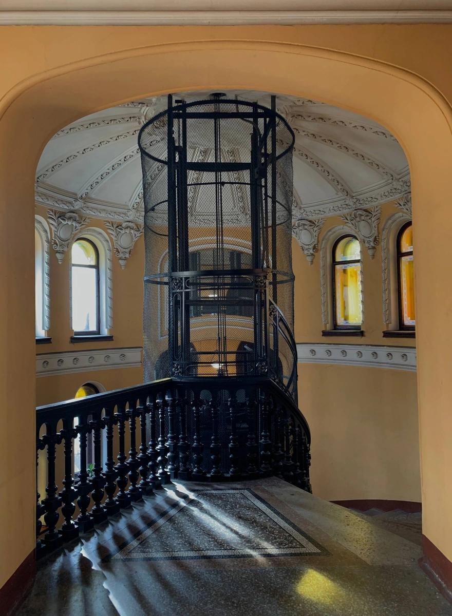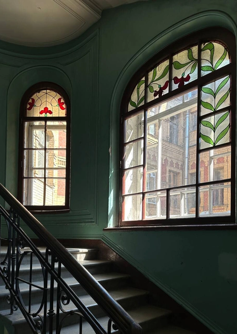 Шикарной лепнины, как в парадных Петербурга и Москвы, тут почти нет. Зато есть потрясающей красоты росписи и конфигурации лестниц (например, горячо любимые мной винтовые), ведь главный вход — это не только дверь, но и множество элементов: