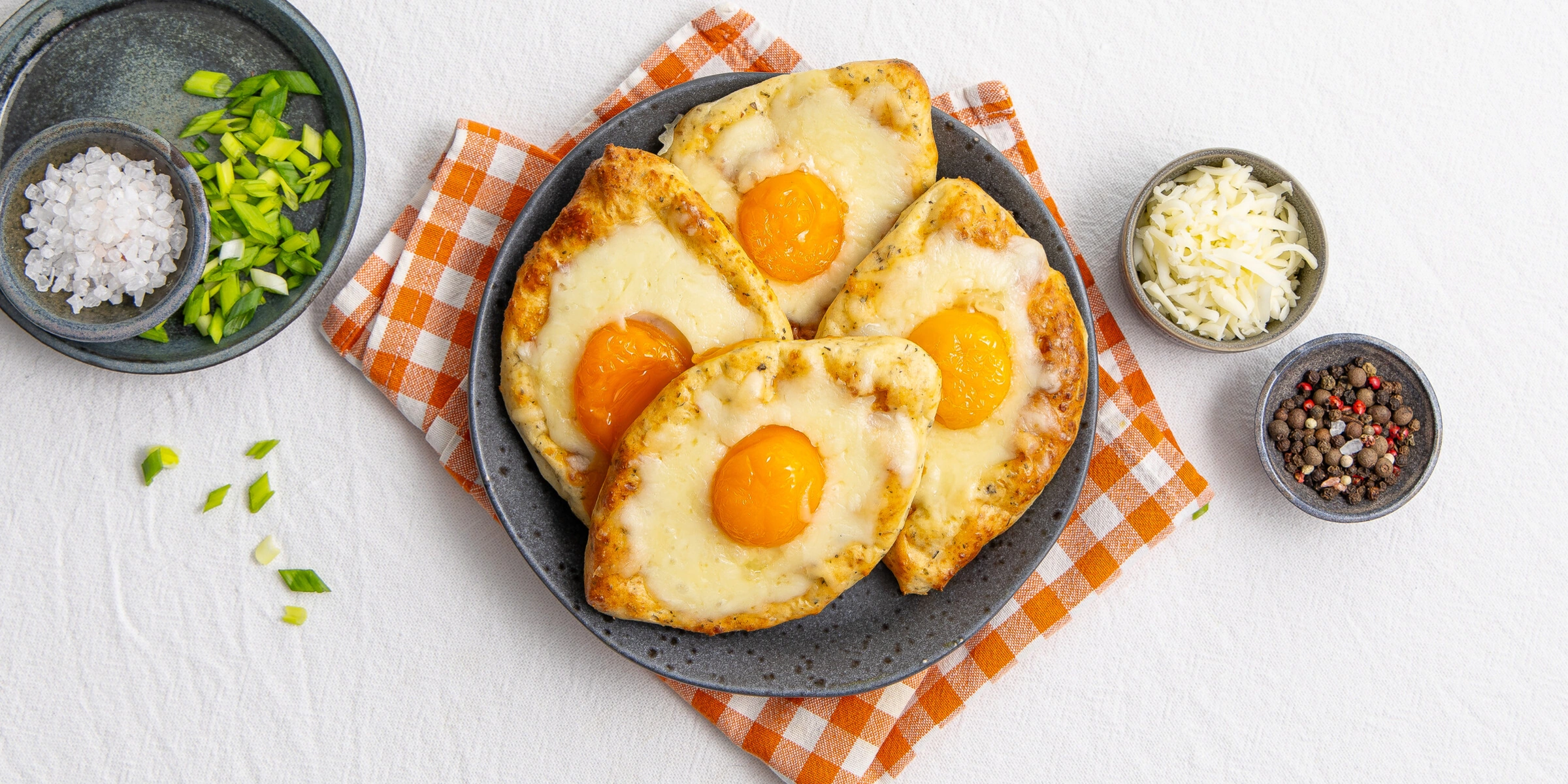 - Верните выпечку в духовку на 4–5 минут, пока сыр не расплавится, а яйцо не схватится.