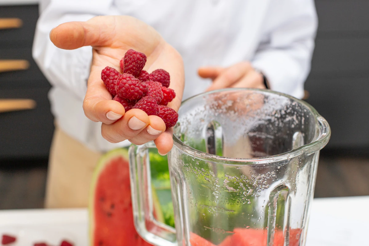 Оставшуюся мякоть арбуза выложите в блендер, добавьте листья мяты, малину, измельчите. При необходимости также процедите через сито.