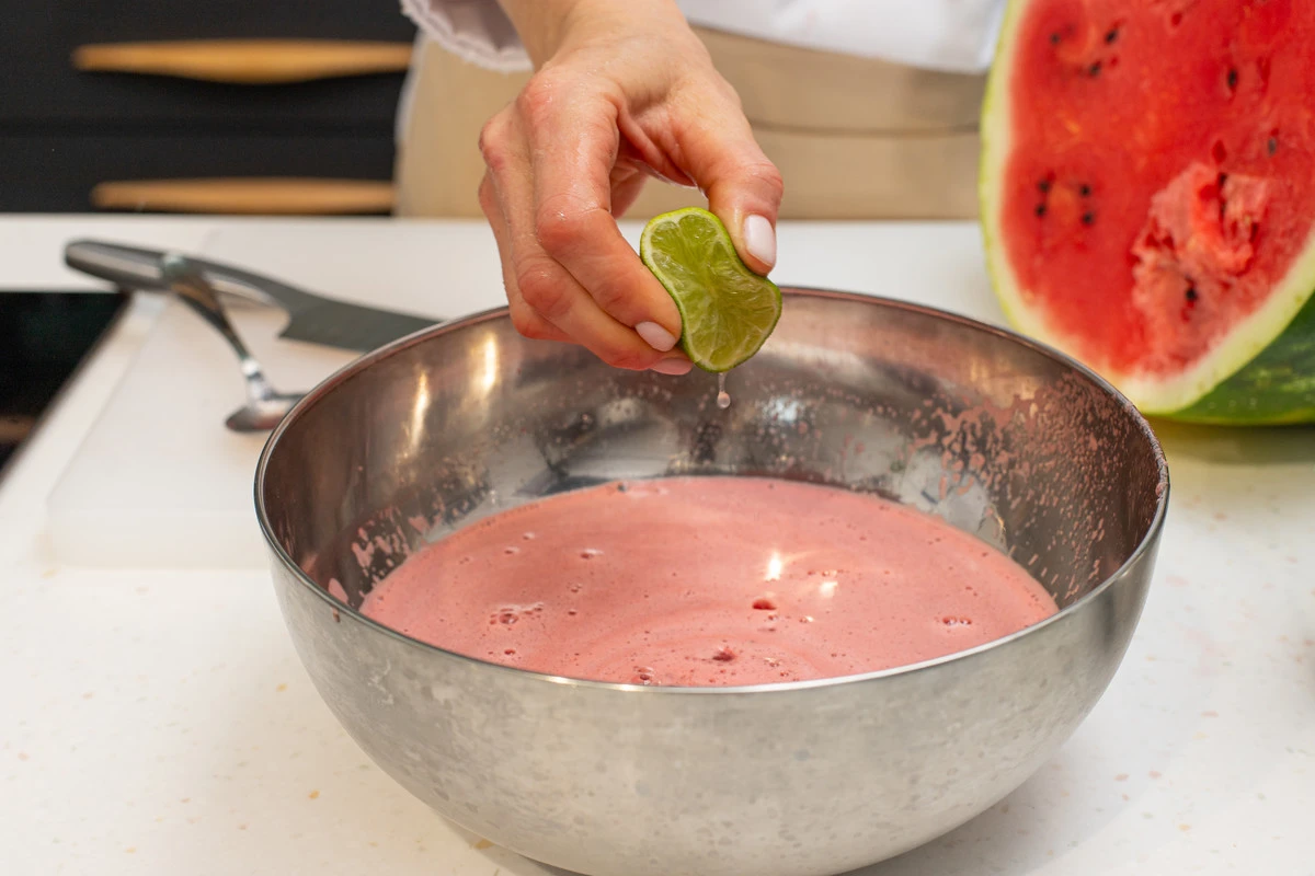 Смешайте измельчённый с водой арбуз и измельчённый с малиной и мятой арбуз, добавьте сок лайма по вкусу, перемешайте.