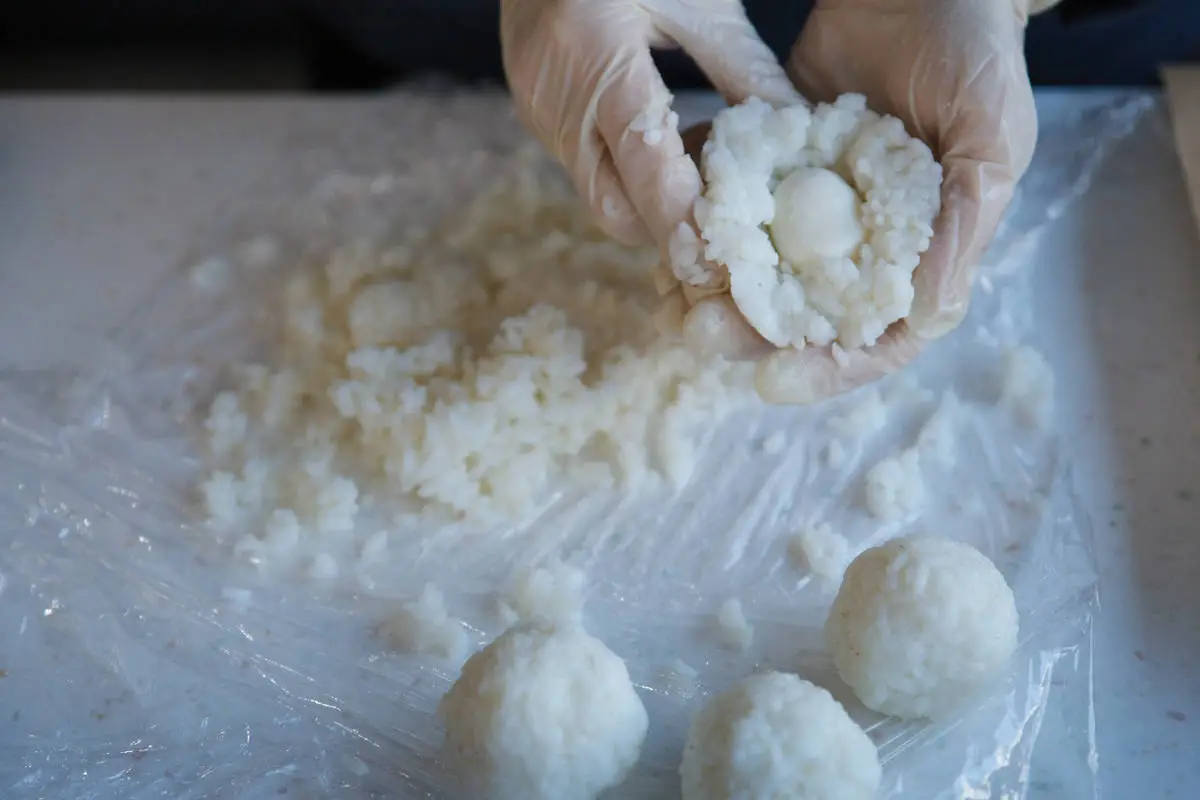 Наденьте перчатки. Возьмите небольшое количество риса и распределите его по ладони. В середину положите шарик моцареллы.