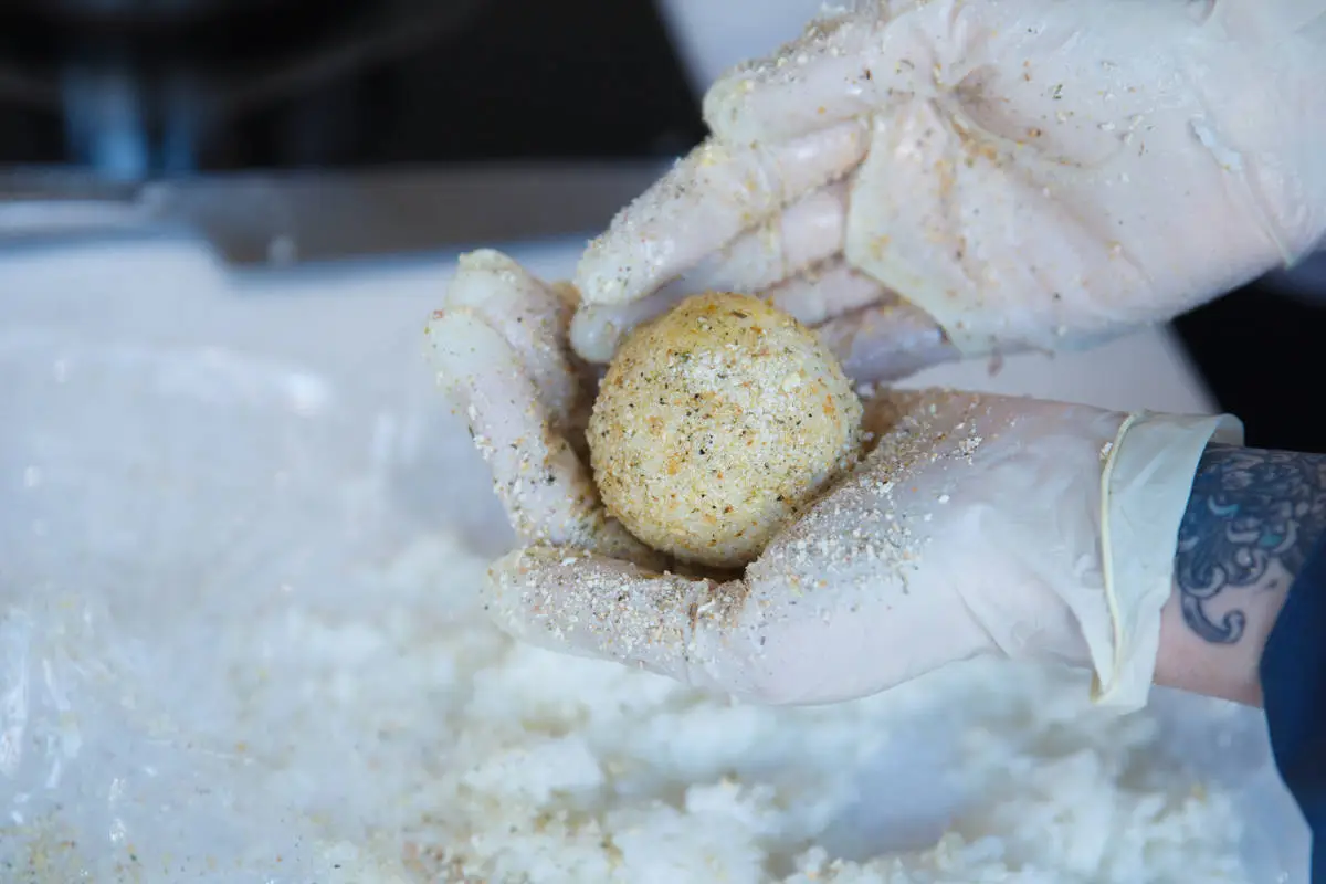 Оберните его рисом и скатайте в шарик. Обваляйте в панировке, а затем смажьте маслом.