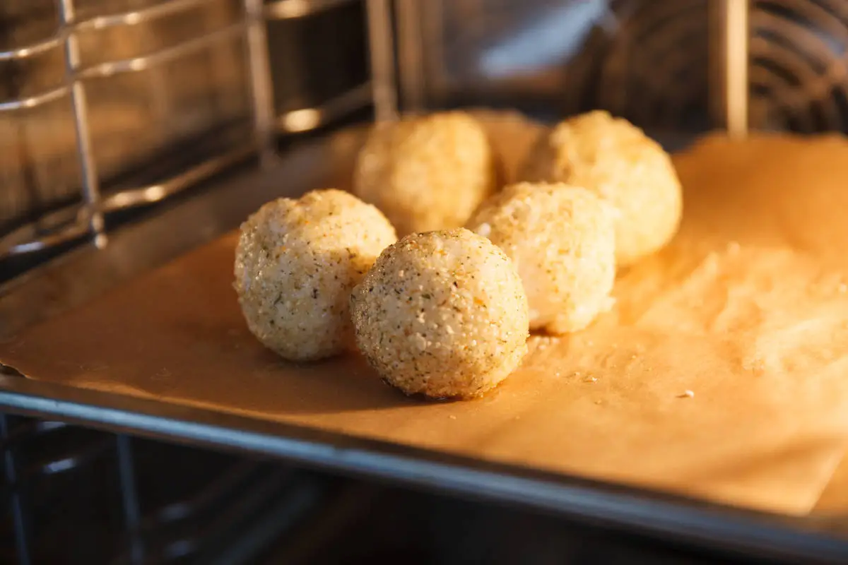 Выложите получившиеся аранчини на покрытый пергаментом противень и запекайте в разогретой до 200 градусов духовке 10-15 минут — до румяной корочки.