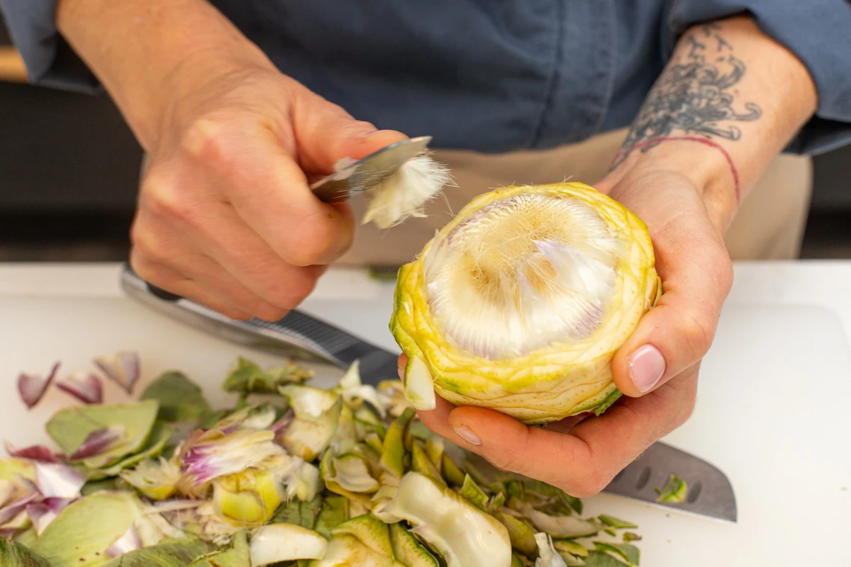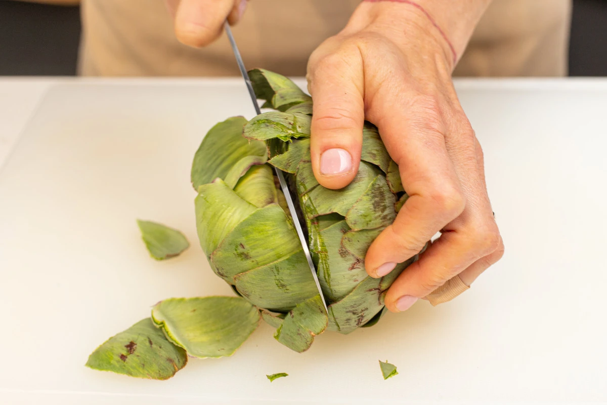 Слегка помните каждый артишок, определяя, где у почки жёсткое место. Отрежьте мягкую часть ножом до начала жёсткой части. С оставшейся части острым ножом срежьте листья.
