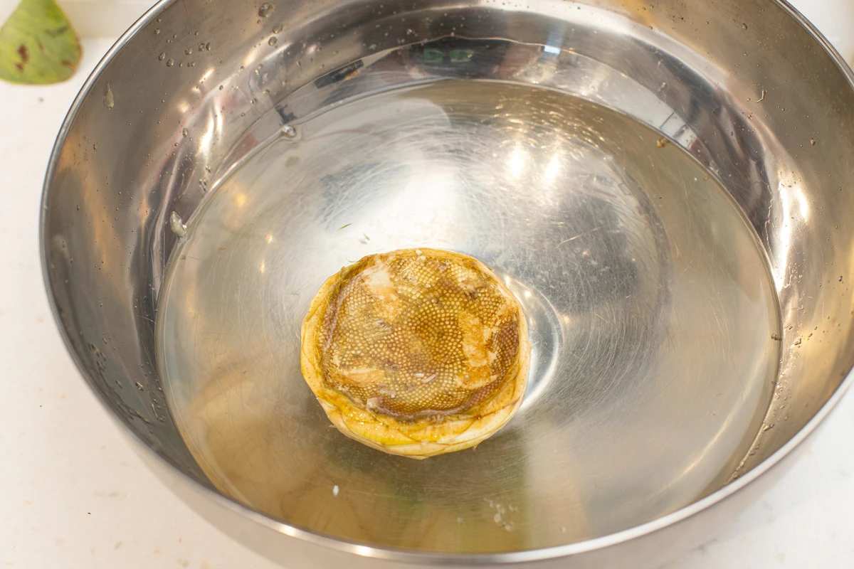 В миску налейте холодную воду, выдавите туда сок половины лимона и положите очищенный от листьев и пушистой сердцевины артишок, чтобы не темнел. Повторите то же самое с остальными артишоками.
