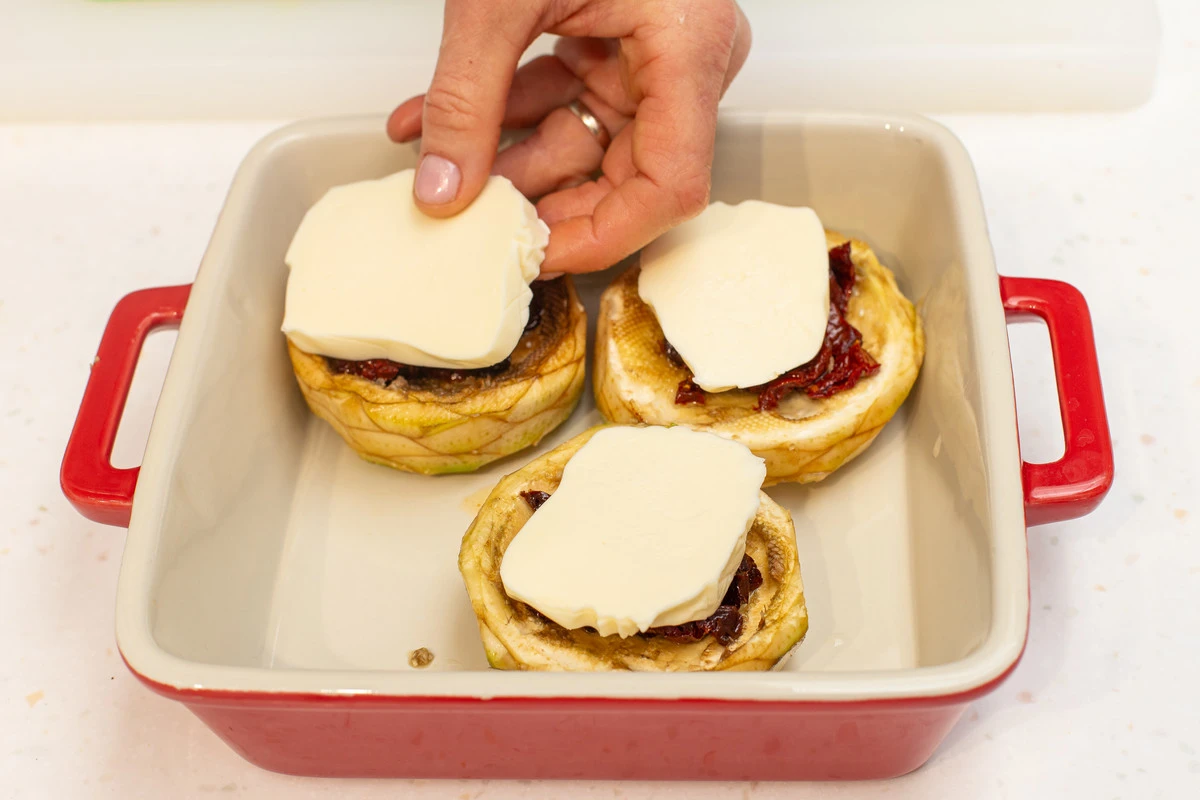 Положите артишоки на противень или в форму для запекания. Вяленые томаты нарежьте соломкой. Выложите на артишоки.