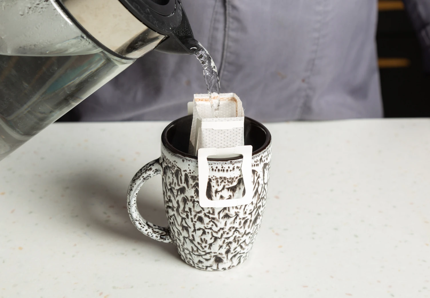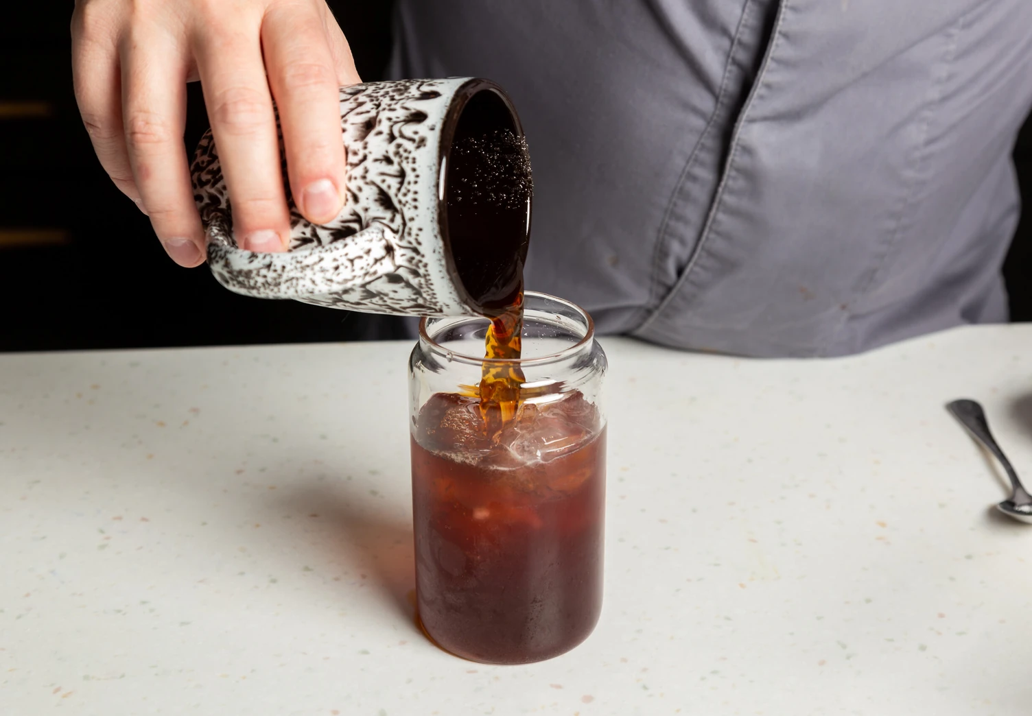 Наполните высокий стакан льдом, вылейте комбучу, затем кофе.