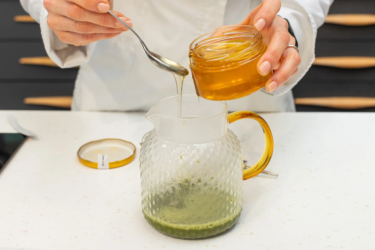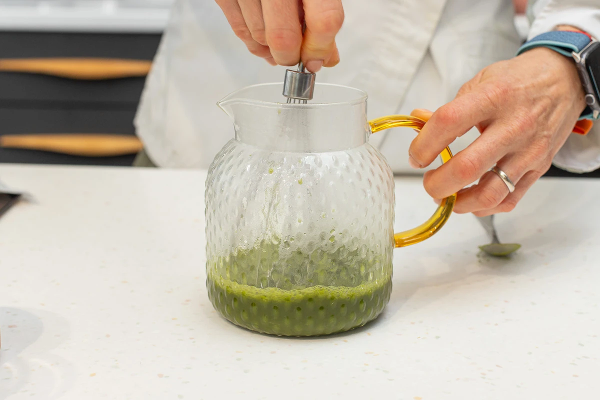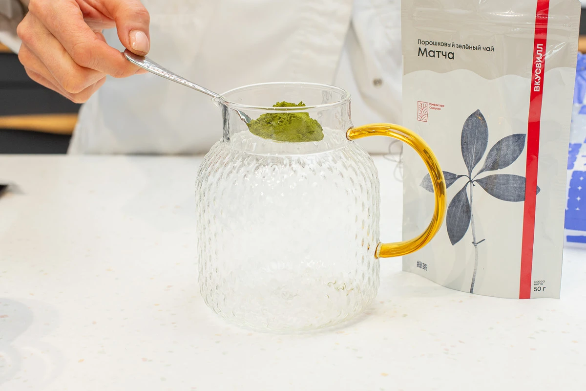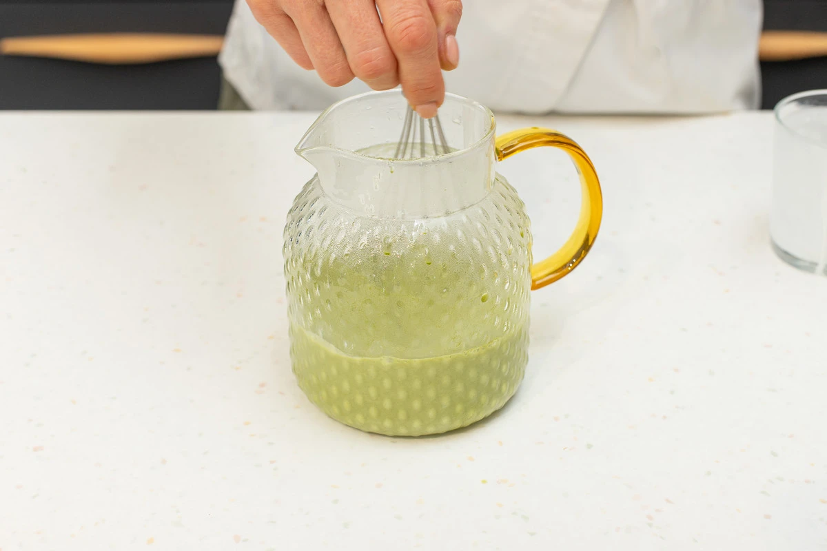 Залейте горячей водой. Хорошо перемешайте венчиком до образования пены, так лучше раскрывается вкус матча.