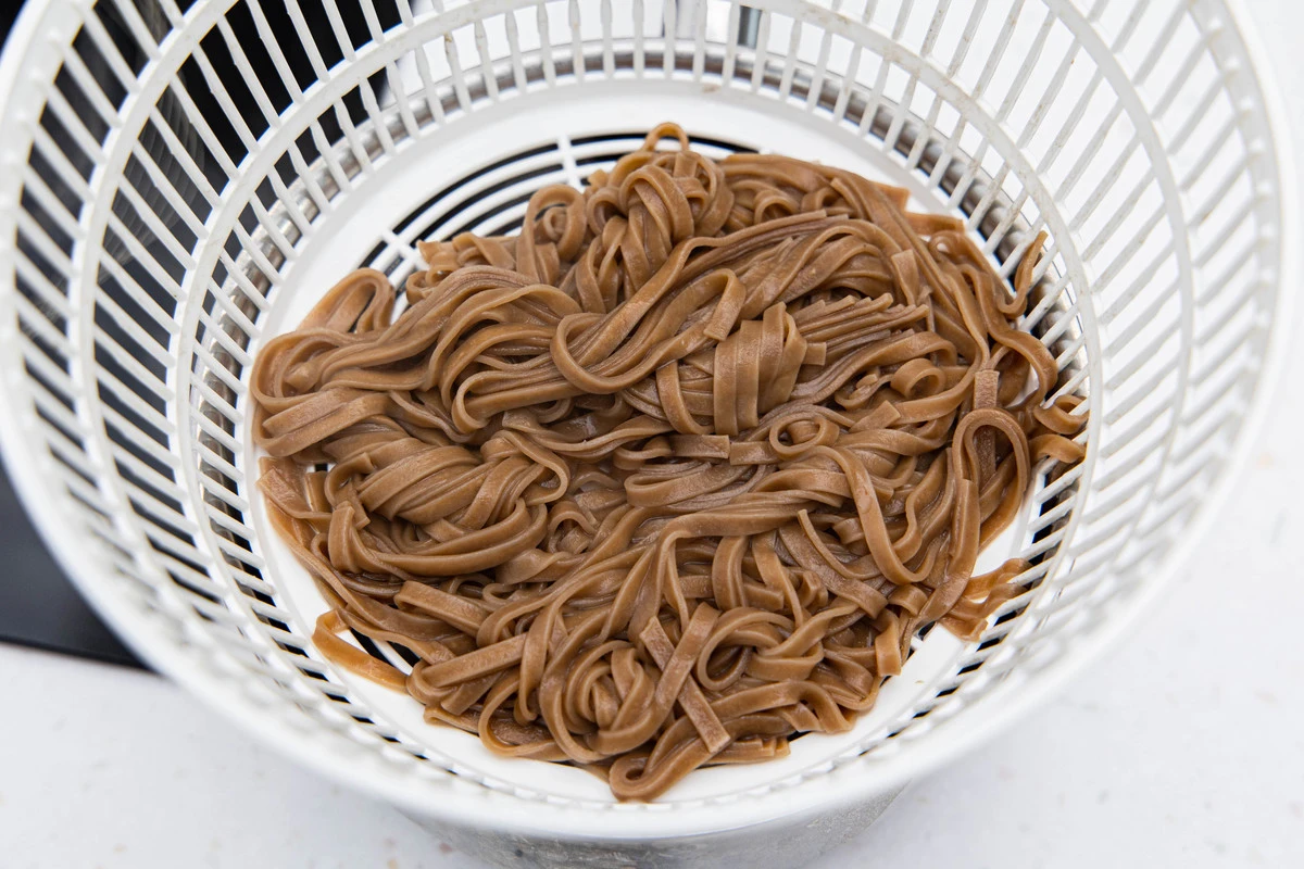 Параллельно в отдельной кастрюле вскипятите подсоленную воду и поставьте вариться собу.