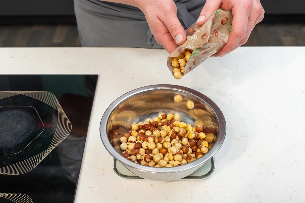Фундук раздробить с помощью блендера до состояния мелкой крошки, но не в муку.