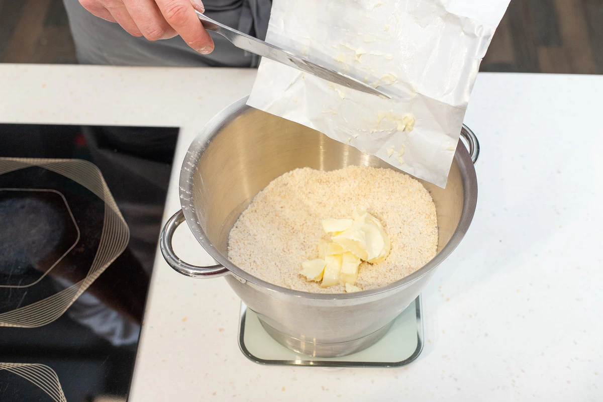 Добавить к сыпучей смеси мягкое сливочное масло и замесить плотное тесто.