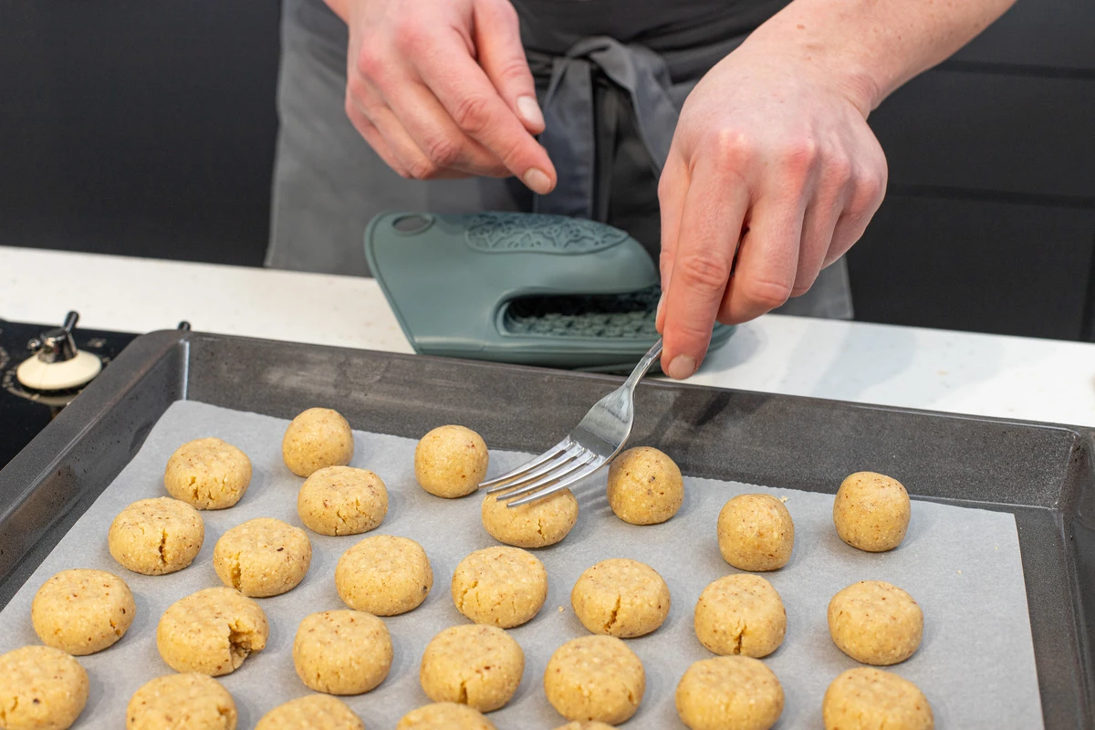 Сформировать шарики примерно по 18 г, выложить на противень, застеленный пергаментом, на расстоянии 7-8 см друг от друга и выпекать при температуре 170°C 16 минут.