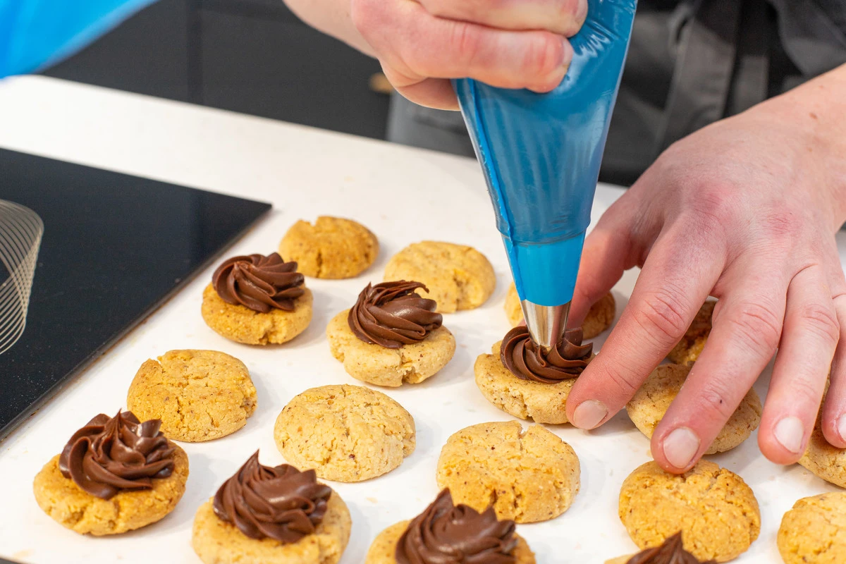 Скрепите охлаждённое печенье в сэндвичи с помощью шоколадного ганаша.