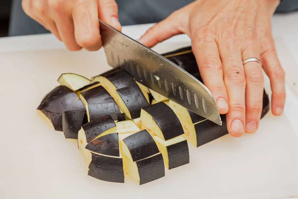 Вскипятите примерно 1 литр воды, бланшируйте баклажаны 3-4 минуты, откиньте на сито, дайте стечь воде.