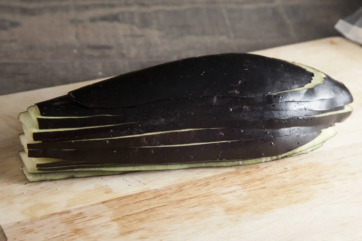 Баклажан нарежьте вдоль тонкими пластинами, посолите каждую и сложите стопкой, придавив тарелкой, оставьте на 5 минут.