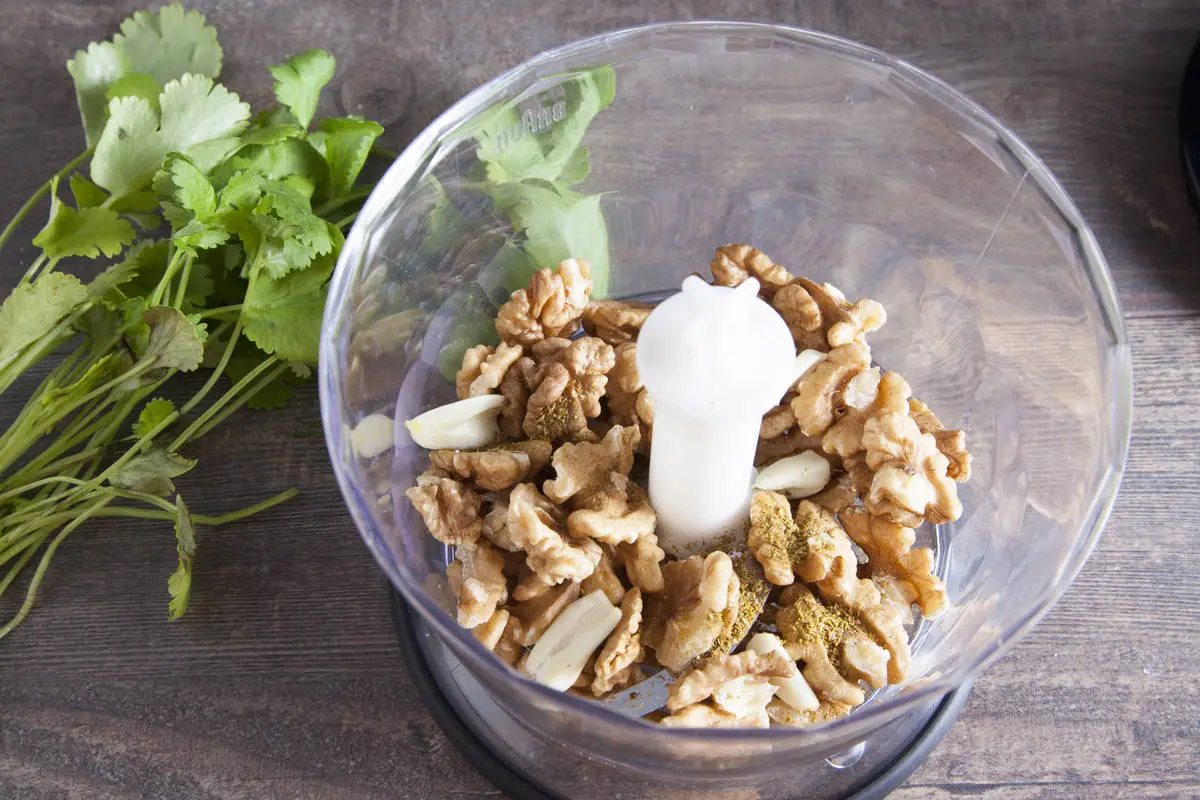 Орехи вместе с очищенными зубчиками чеснока пробейте в блендере до мелкой крошки.