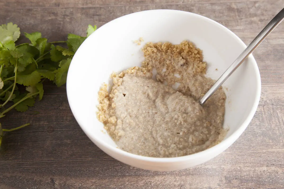 Добавьте уксус или лимонный сок и разведите теплой водой до консистенции негустой сметаны, добавьте хмели-сунели и посолите. Попробуйте, соус должен получиться пикантным, возможно придется добавить еще немного уксуса или сока. Мелко нарежьте веточки кинзы, оставьте несколько целыми для украшения, порубленную кинзу добавьте к орехам, перемешайте.