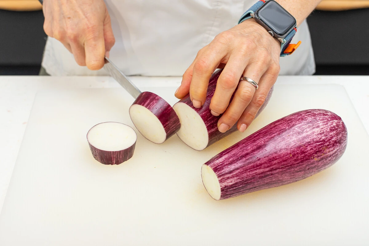 Прекрасное блюдо для летнего ужина, хотя вообще-то его можно приготовить в любое время го-да. Мы взяли вкусные полосатые баклажаны «Граффити» — у них мелкие семена и тонкая кожица, они не горчат, а значит, их не нужно предварительно замачивать и можно сразу запекать. И эстетично, и вкусно, и меньше хлопот — сплошные преимущества.