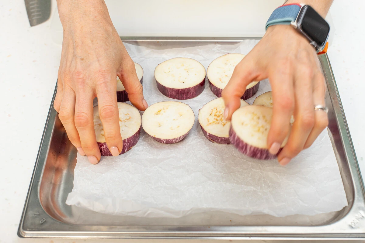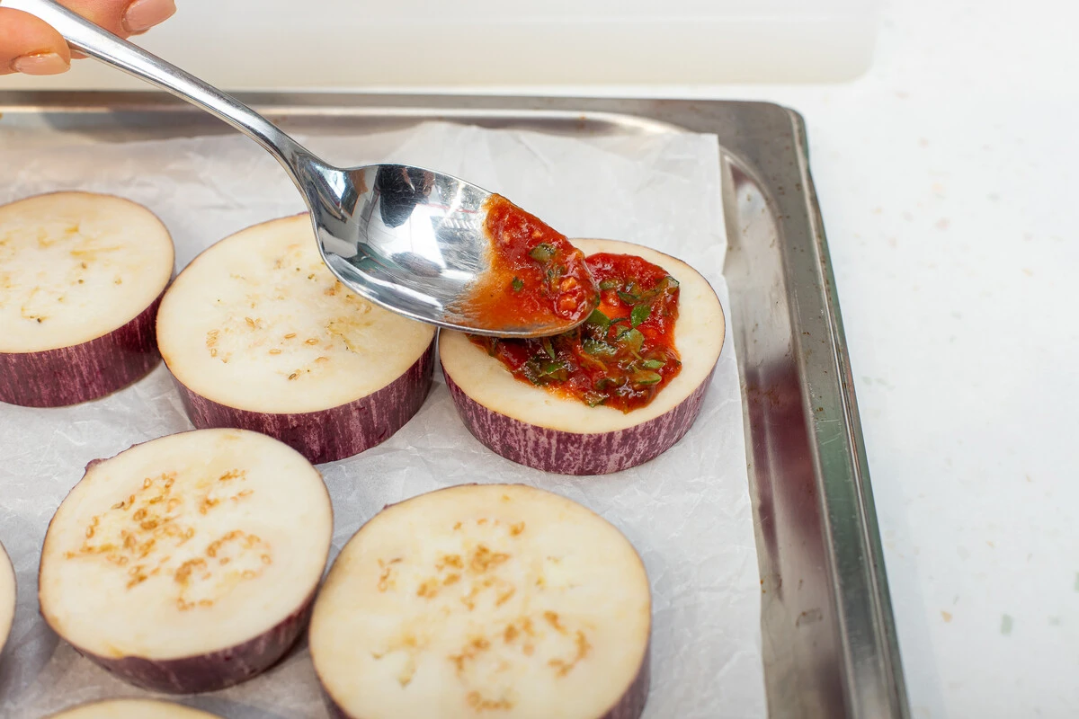 Выложите на каждую шайбу баклажана примерно 1 ч. л. подготовленного соуса. Поставьте противень в разогретую до 200 ℃ духовку и запекайте 12-15 минут. Если у вашей духовки есть режим конвекции, включите его.