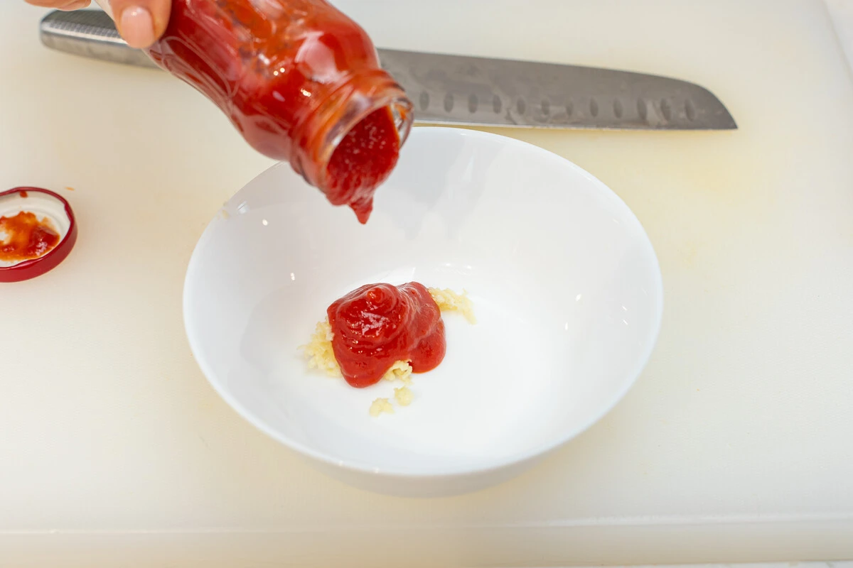 Чеснок почистите и пропустите через пресс. Положите в мисочку и добавьте томатный соус.