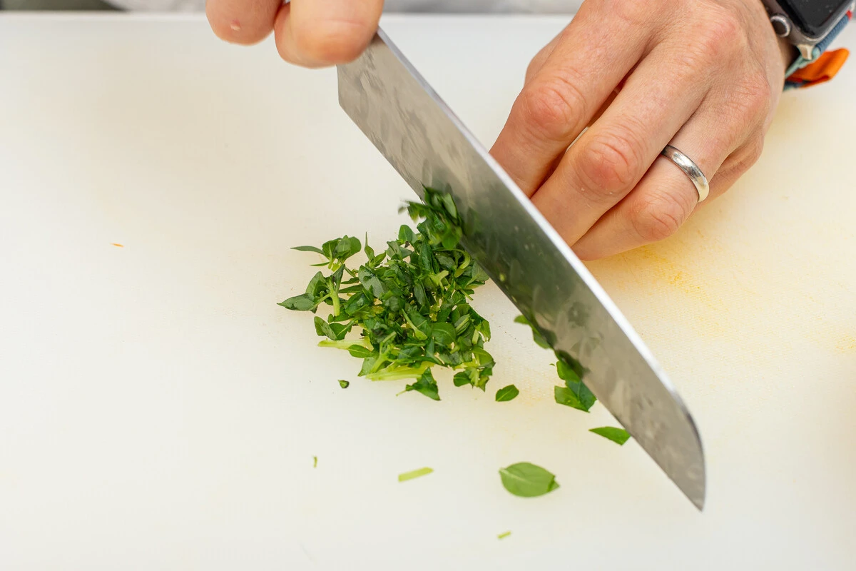 Мелко нарежьте базилик (вам понадобится примерно 2 ст. л. измельчённых листьев). Добавьте зелень в томатный соус с чесноком и перемешайте до соединения компонентов.