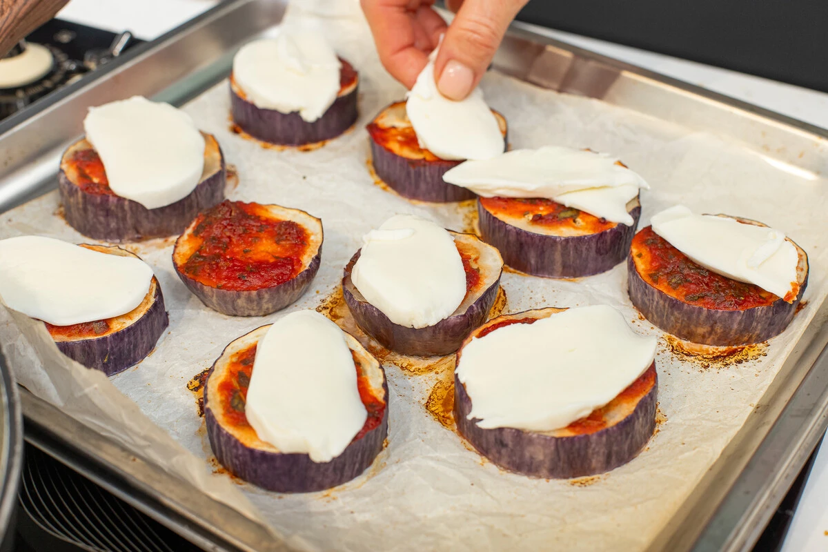 Нарежьте моцареллу. Выложите на каждый баклажан по ломтику моцареллы. Запекайте ещё примерно пару минут при 200 ℃, пока сыр не расплавится и немного не подрумянится.