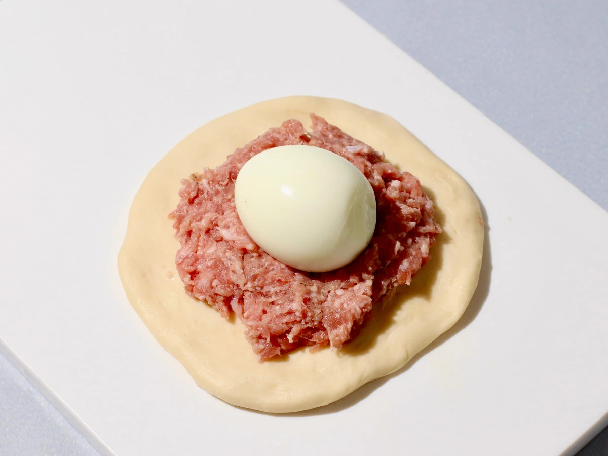 Тесто разделите на 4 части, раскатайте лепёшки. На середину каждой выложите по 2 столовые ложки фарша, сверху — яйцо.